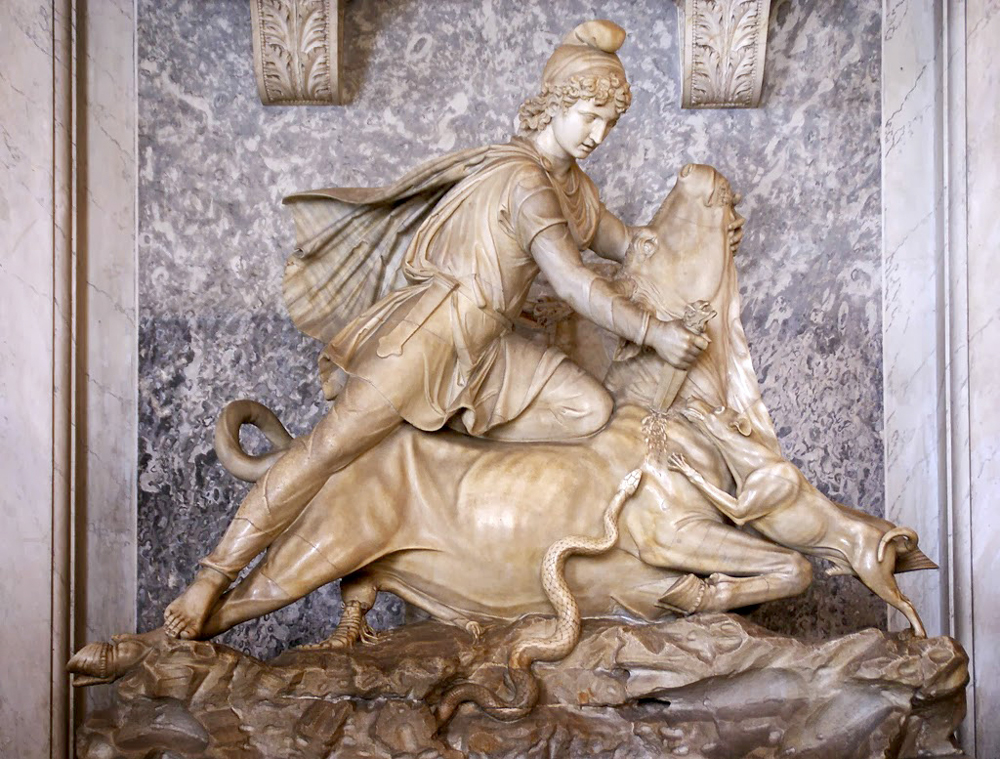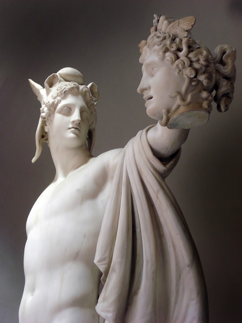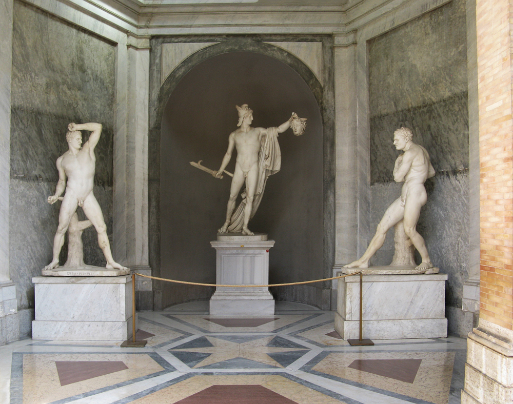 Антонио Канова. Статуя была выполнена по заказу папы Пия VII, чтобы заменить оригинал, разрушенный войсками Наполеона. Персей изображен в шлеме Аида, с мечом Гефеста, в сандалиях Гермеса и с головой Медузы в руке. Рядом с Персеем стоят статуи Крегаса и Дамоксеноса.