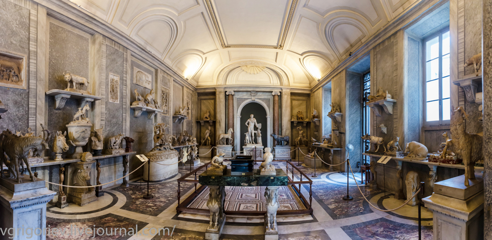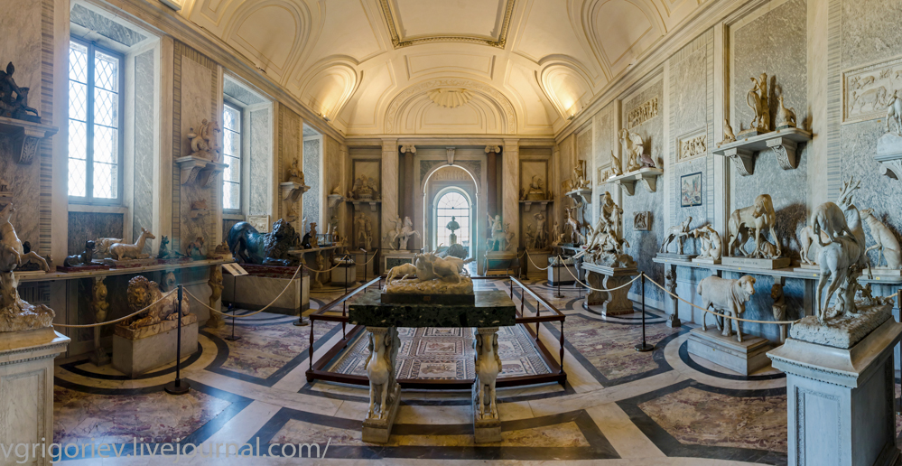 В Зале животных находится самое богатое в мире собрание античных скульптур, изображающих различных животных (около 150 статуй) из цветного и белого мрамора и алебастра. Часть скульптур представляет собой копии греческих и римских оригиналов, выполненные по заказу папы Пия VI итальянским скульптором Франческо Антонио Францони (1734-1818), часть других составлена Францони из подлинных античных фрагментов. Также здесь выставлены статуя Мелеагра с собакой и головой Калидонского вепря (римская копия греческого оригинала Скопаса IV век до н.э.), торс Минотавра (греческий оригинал, V век до н.э.), римские саркофаги, принадлежавшие членам известной патрицианской семьи Сципионов. Статуи были отреставрированы в конце XIX века.