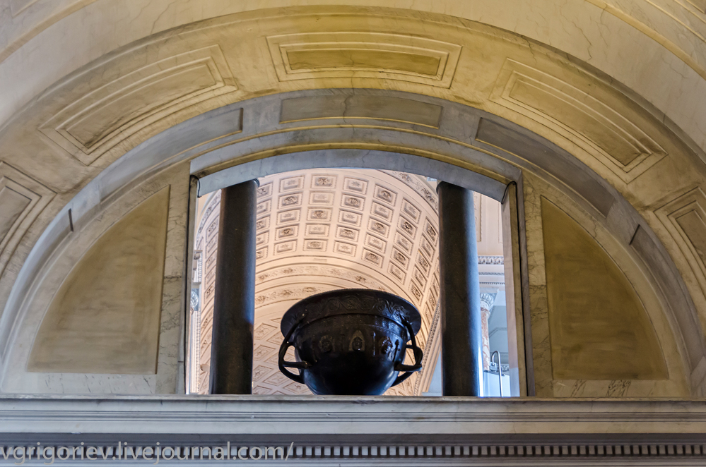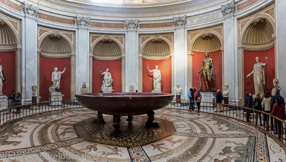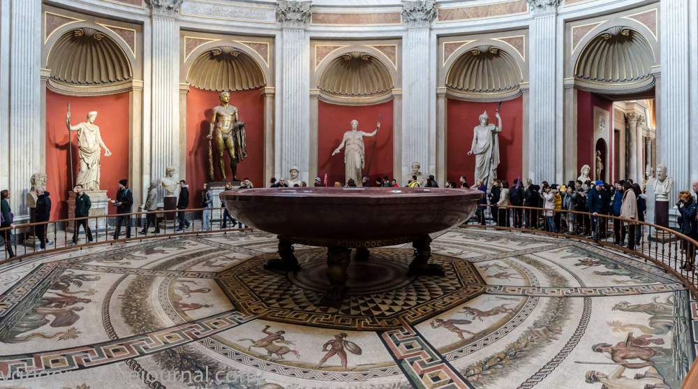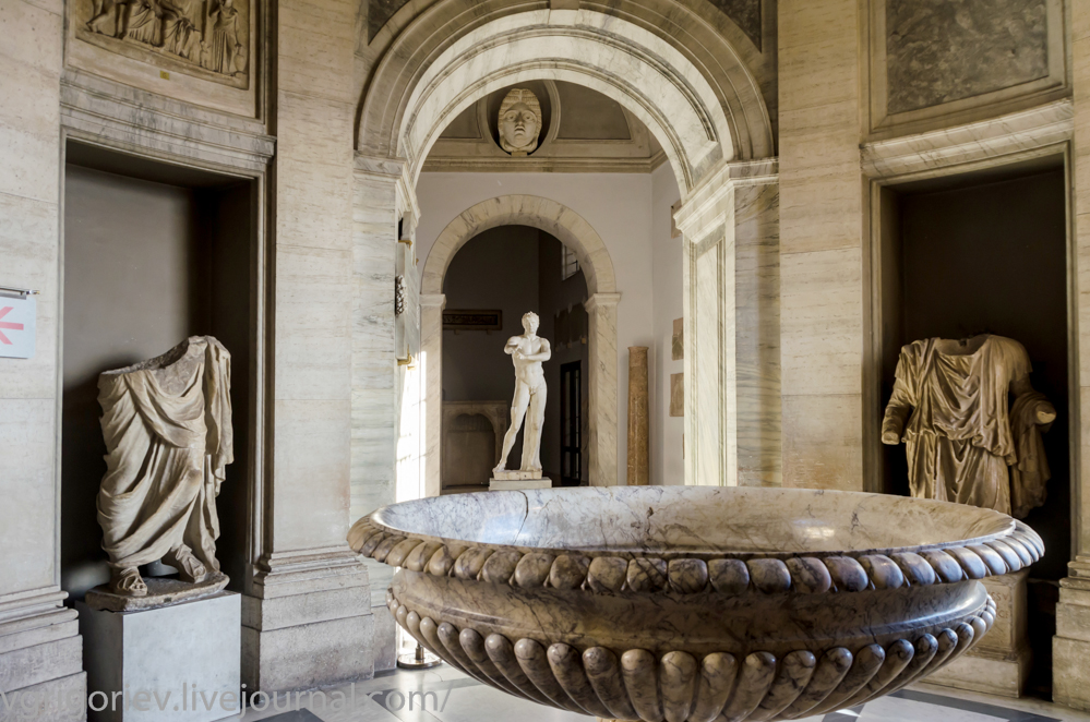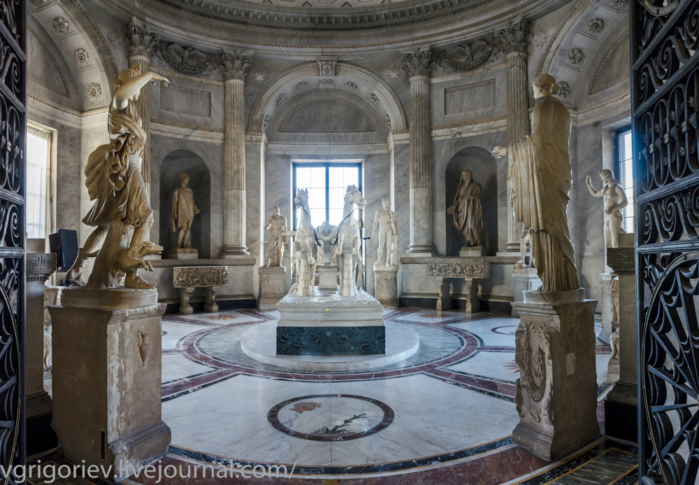 Зал Ротонда построен Микеланджело Симонетти в 1780-1782 гг. в соответствии с идеалами классицизма XVIII в. В центре зала находится огромная монолитная порфировая чаша (13 м диаметром) из Золотого дома императора Нерона. В нишах установлены 18 статуй и бюстов римских и греческих богов и героев, среди них: