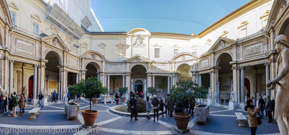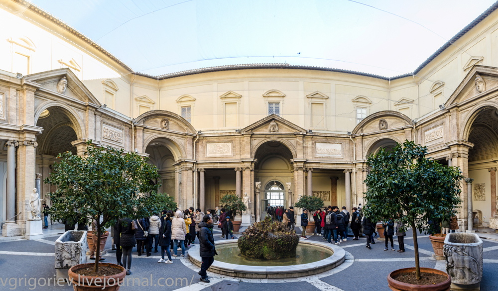 Внутренний дворик - сердце и историческое ядро Ватиканских Музеев. Первоначально здесь был разбит апельсиновый сад квадратной формы, впоследствии превращенный по распоряжению папы