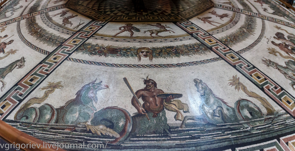 Пол украшает римская мозаика (III век) из терм Отриколи (в Умбрии), изображающая битву греков с кентаврами, тритонами и нереидами.