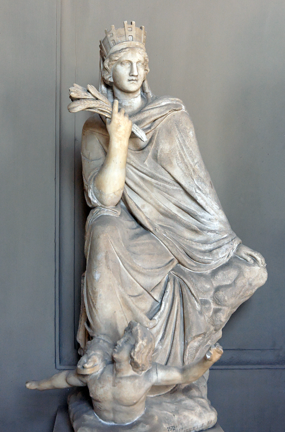 Антиохии. Богиня увенчана крепостными стенами города, а у её ног плывёт юноша, символизирующий реку Оронт. Римская копия с греческого оригинала I в.