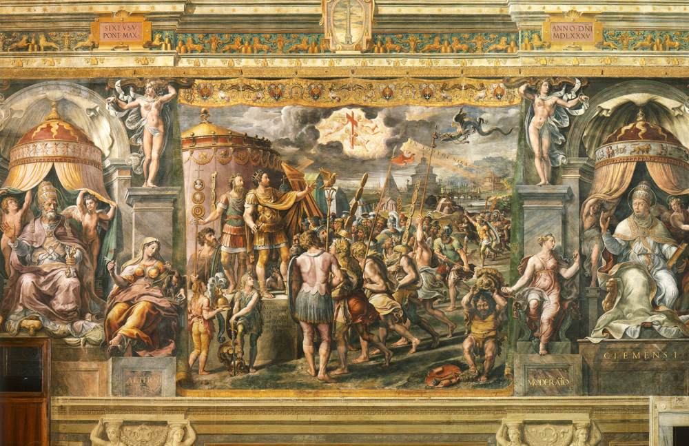 "Передача в дар Рима" изображен император Константин, передающий Папе Сильвестру право на мирское правление над западом Римской империи, символически представленное в виде позолоченной статуэтки богини Рима.