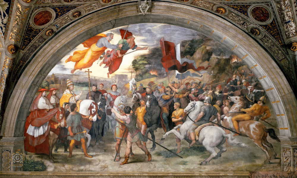 Аттилой, и включает в себя образы Святого Петра и Святого Павла в небе, держащих мечи. Первоначально Рафаэль изобразил Льва с лицом папы Юлия II, но после его смерти Рафаэль изменил картину, чтобы походить на нового папу Льва X.