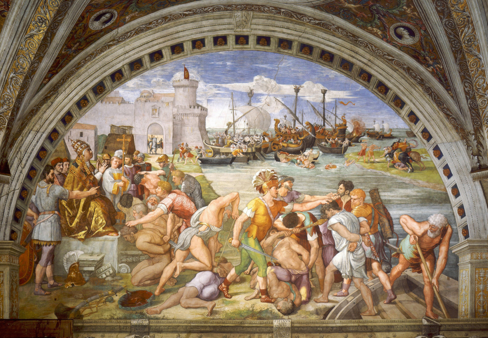 морского сражения между папскими и сарацинскими галерами, произошедшее в IX веке близ порта Остия в устье Тибра. В 846 году мусульманские завоеватели напали на Остию, разграбили местный собор и увезли с собой множество пленных, набив ими трюмы своих кораблей. Через три года они вновь вернулись за добычей, но на сей раз победа осталась за папскими воинами, и восседающий на мраморной глыбе, как на троне, понтифик обращает благодарственный взор к небесам. Это ещё одно изображение Льва X, а рядом узнаваемы кардиналы Джулио Медичи, Биббьена и другие высокопоставленные лица.