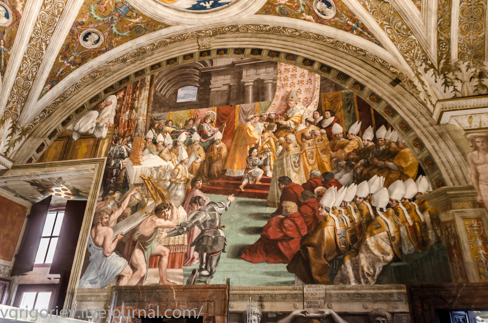 "Коронация Карла Великого Папой Львом III" (1516-1517) повествует о событии, имевшем место в 800 году в старинной Базилике Святого Петра. С учётом состоявшейся исторической встречи в Болонье французского монарха Франциска I с римским понтификом Львом X в 1516 году с целью заключения союза между Францией и Ватиканом, Карл Великий обрёл сходство с Франциском I по имеющемуся рисунку, сделанному одним из болонских художников, а Льву III соответственно приданы черты папы Льва X.