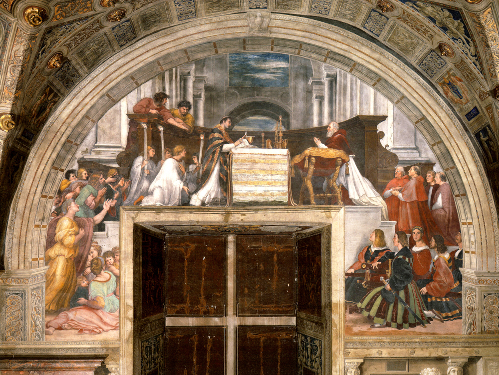 "Мессе в Больсене" изображено чудо, которое произошло в 1263 г., когда во время богослужения хостия в руках у неверующего священника обагрилась кровью. При этом событии присутствует коленопреклонённый папа Юлий II, а справа расположилась группа швейцарских гвардейцев из папской стражи, одетых в яркие костюмы.
