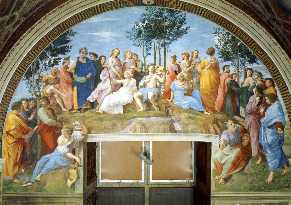 "Парнас" (1509-1510) - Аполлон, играющий на лире да браччо. Вокруг него девять муз и литераторы - античные, средневековые и ренессансные. Слева изображены слепой Гомер, Вергилий, Данте, Петрарка, Анакреонт, Сапфо и другие, справа - Теренций, Ариосто, Овидий, Гораций, Боккаччо и другие.
