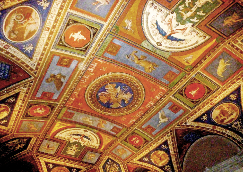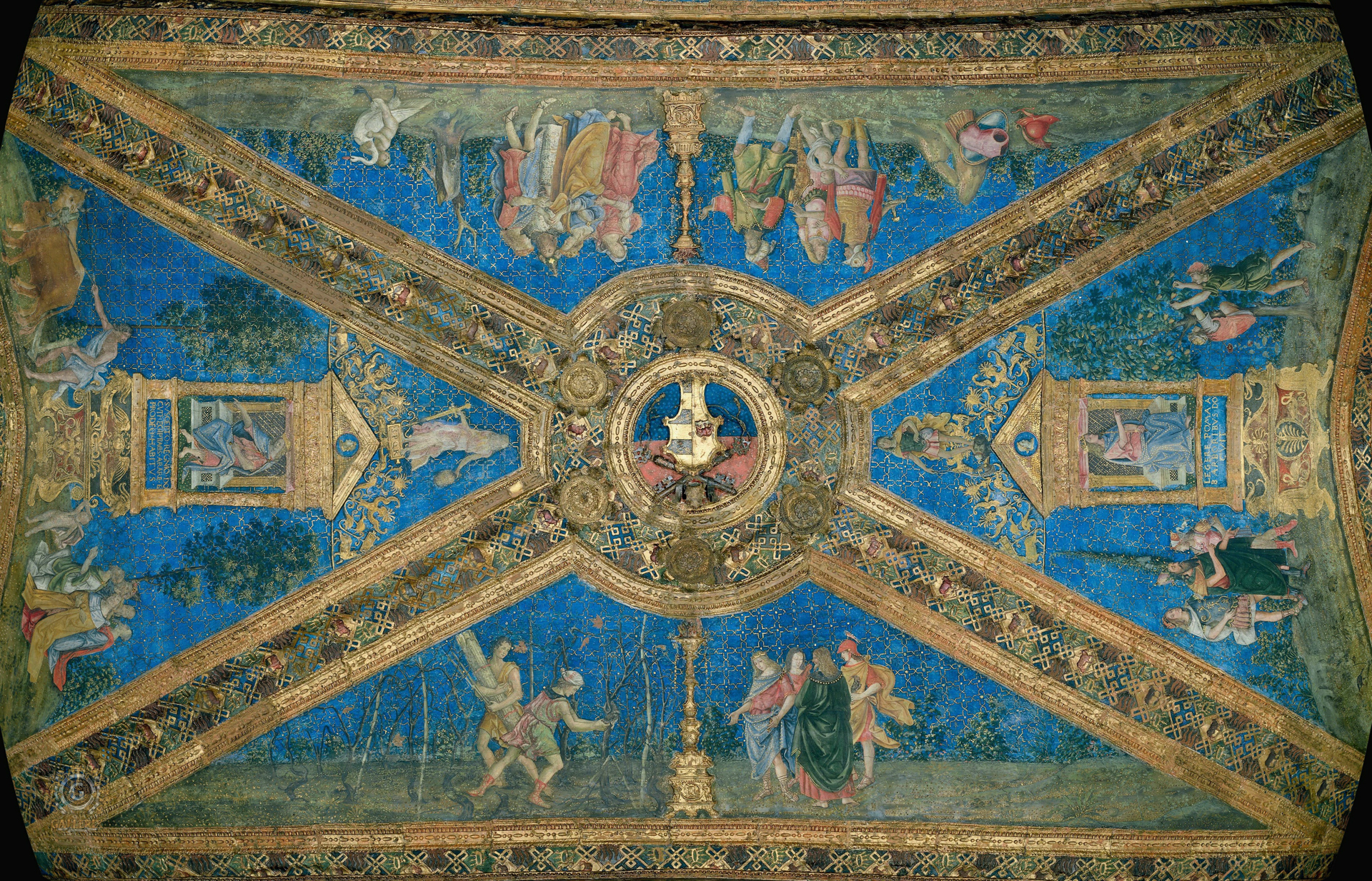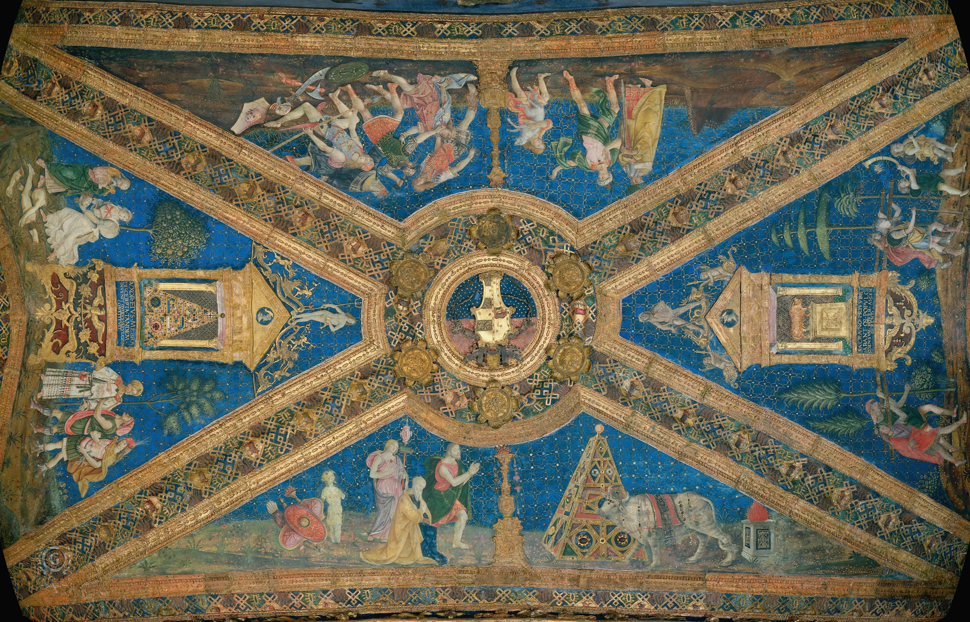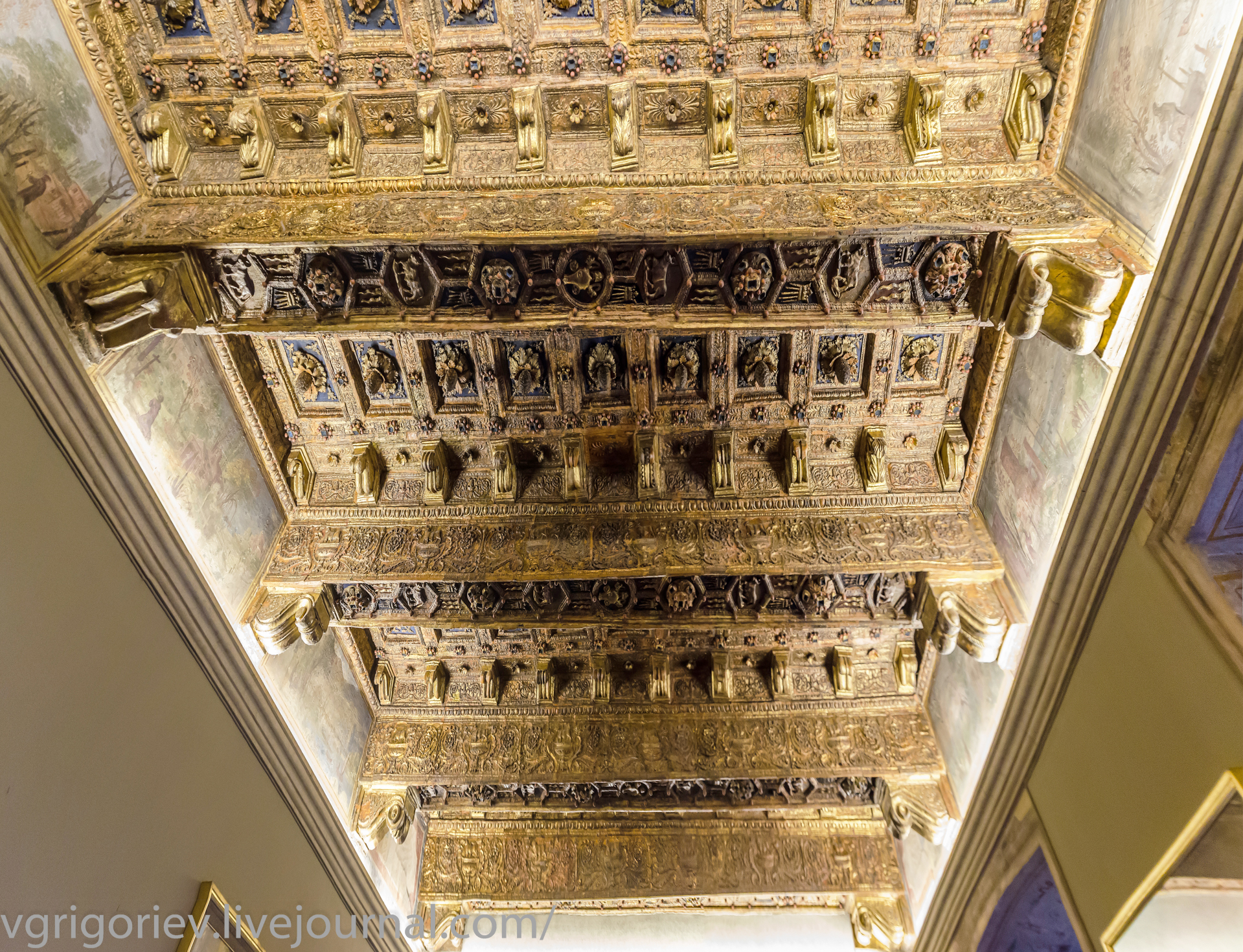 Потолок зала украшен сюжетами из мифов об Изиде и Осирисе и о быке Аписе - редкая тема в иконографии Ренессанса.