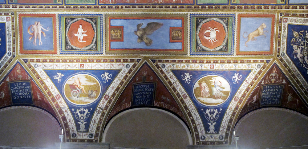семи свободным искусствам: Риторика, Грамматика, Диалектика (логика), Геометрия, Арифметика, Музыка и Астрономия изображены в виде дам, в их окружении деятели искусства XV века: писатель Паоло Кортези изображен как Цицерон на фреске Риторика; возможно Браманте, преклонившийся перед Евклидом, на фреске Геометрия. Этот зал, вероятно, являлся рабочим кабинетом папы.