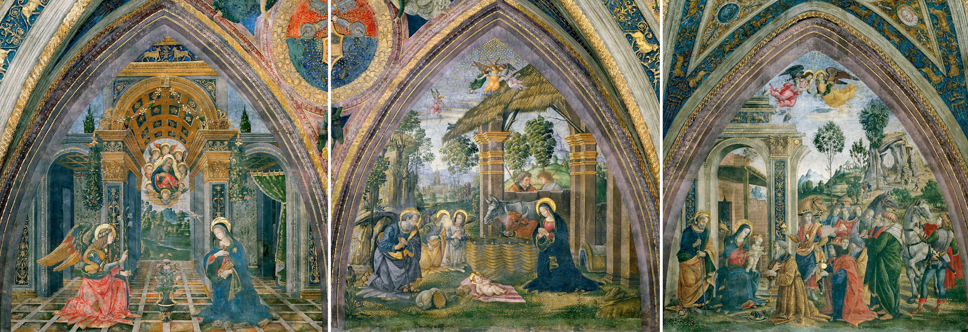 Бернардино Пинтуриккьо и художников его мастерской. Известность Пинтуриккио принесла скрупулезная точность в деталях сложных орнаментальных композиций, использование броских цветов и золотых сплетений, непревзойденное мастерство в рисовании роскошных одеяний и пленительных пейзажей. Он отличался свежим и современным подходом к исконно традиционным темам церковного письма. После смерти Александра VI папы не захотели больше жить в этих помещениях, и они были надолго покинуты. В 1816 г. по приказу Пия VII здесь разместили картины, возвращённые из Парижа после падения Наполеона, а при Льве XIII апартаменты были отреставрированы и открыты для публики.