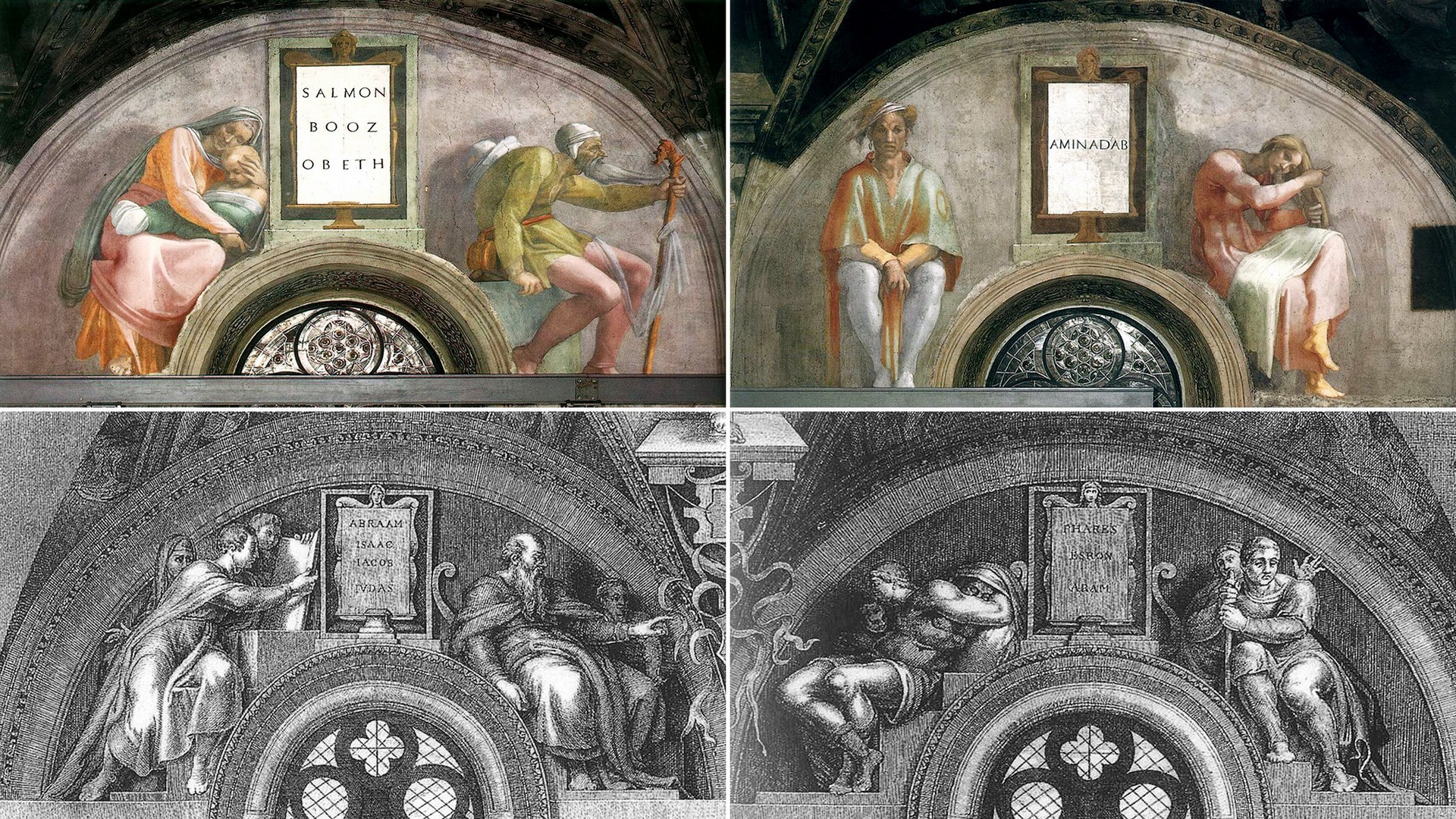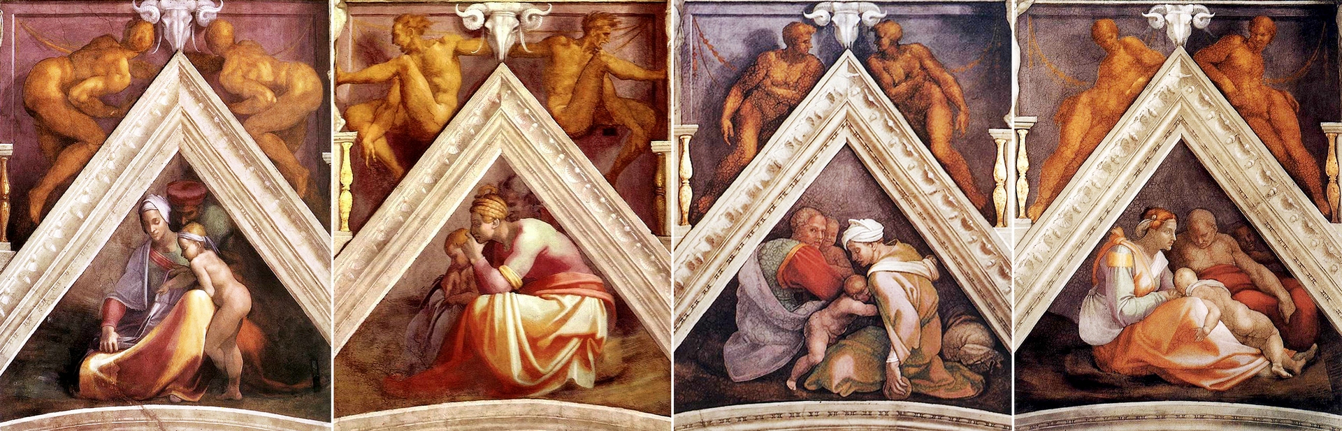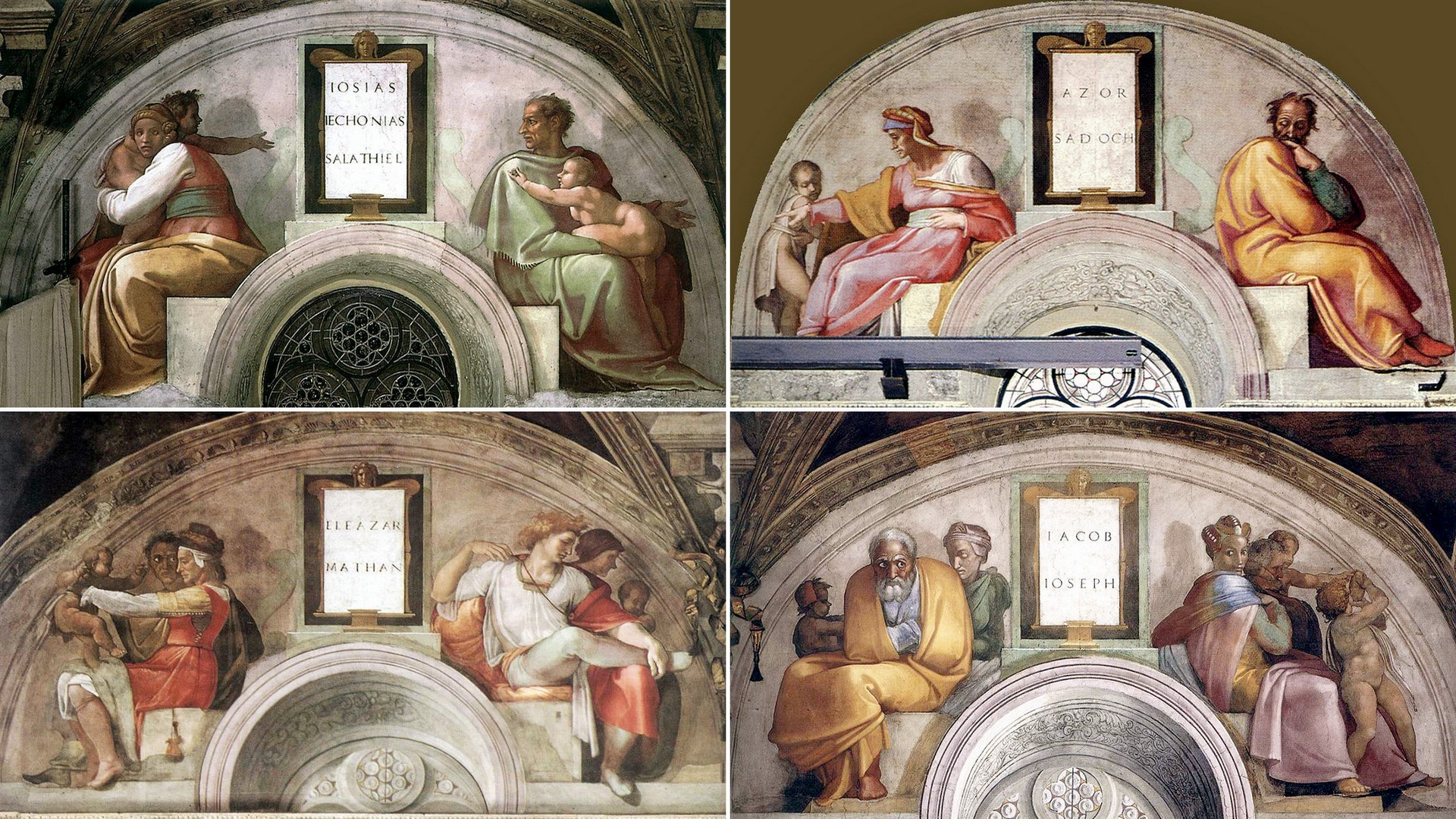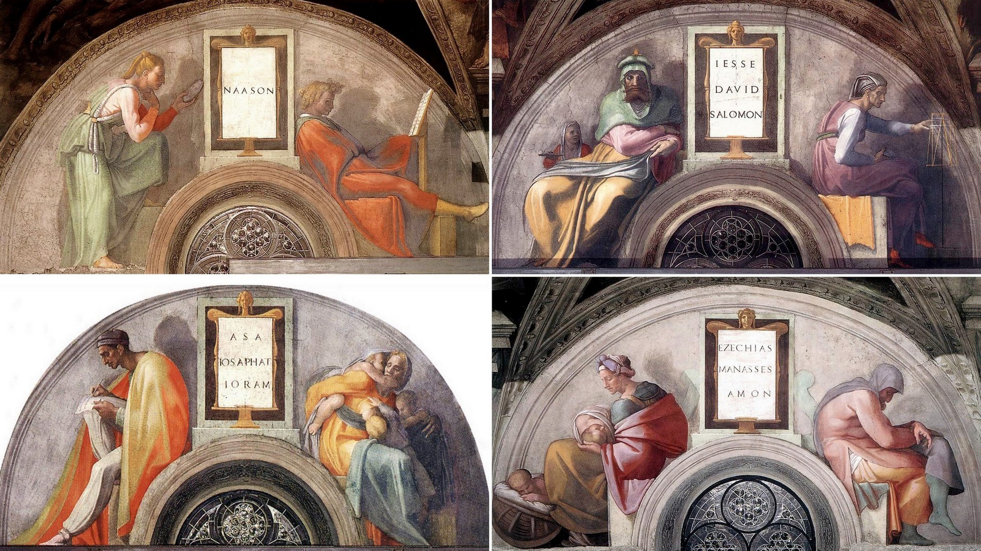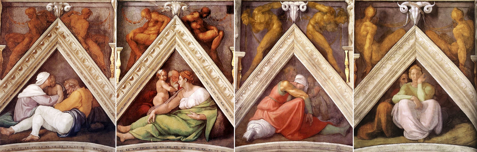 "древа Иессеева", названного в честь Исайи, отца Давида. Было распространено, особенно на витражах, изображение "древа", корнем которого был лежащий Иессей. Фигуры в люнетах по всей видимости - изображение семей, но семей разделённых, как в буквальном смысле - табличками с именами предков Иисуса, так и в переносном, представляя собой весь спектр человеческих эмоций. Из четырнадцати сохранившихся люнетов, два, что, вероятно, были созданы в самом начале, с семьями Елеазара и Матфана и Иакова и Иосифа являются наиболее детально проработанными. Кроме того, еще два люнета были сколоты при создании алтарной фрески "Страшный суд". Их можно увидеть только на старинных гравюрах.