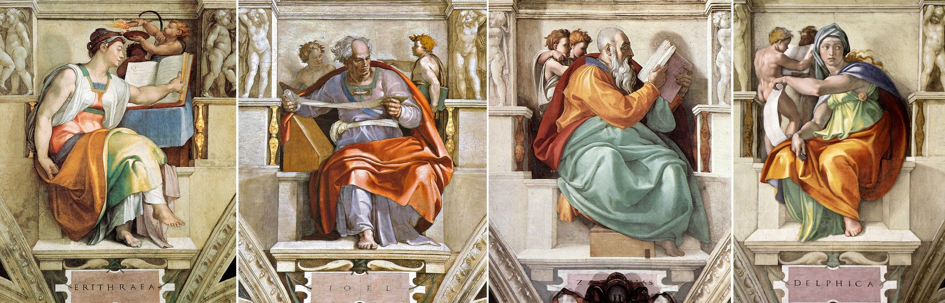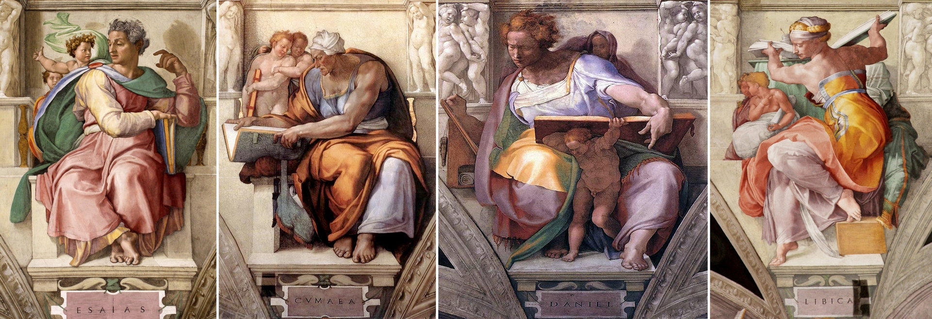 Сивиллы - пророчицы, жившие в храмах по всему Древнему миру. Считается, что сивиллы, изображённые Микеланджело, предсказывали рождение Христа. Неизвестно, почему Микеланджело поместил изображения именно этих пятерых предсказательниц из десяти-двенадцати известных сивилл. Есть предположение, что выбор был по географическому признаку: сивиллы представляют различные уголки Земли - Африку, Азию, Грецию и Ионию.