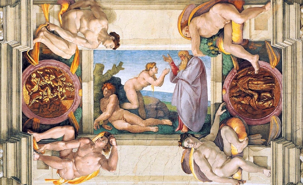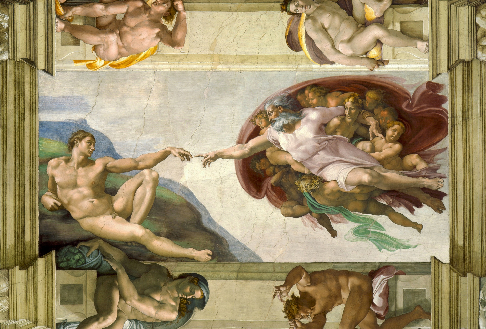Центр плафона Микеланджело отвёл истории Адама и Евы. Первый эпизод из центральной группы - Сотворение Адама - одно из наиболее знаменитых изображений в истории мировой живописи. Микеланджело создал абсолютно новую иконографию, выбрав момент, когда Бог протягивает руку просыпающемуся Адаму, передавая ему жизнь. Центральный мотив композиции - две протянутые навстречу руки. Энергичное движение Создателя, окружённого свитой, подчёркнуто необыкновенно гармоничной позой первого человека на Земле. Мнения исследователей относительно того, кого представляет женская фигура в свите Творца, расходятся. Одни склонны видеть в ней Марию, однако это предположение сомнительно. По мнению других это Ева, появление которой уже задумано Создателем. Существует также гипотеза, что образ Божественной мудрости (Софии), присутствовавшей при сотворении Богом мира, об этом говорится в библейских Притчах и в "О граде Божьем" Августина. Некоторые исследователи считают, что внизу слева в тени изображены Люцифер и Вельзевул, которые отказывались признать, что Адам был венцом творения Создателя. По их мнению, левой рукой Творец опирается на младенца Христа. Двойная складка плаща, охватывающего всю божественную свиту, играет роль границы между Христом и Люцифером.