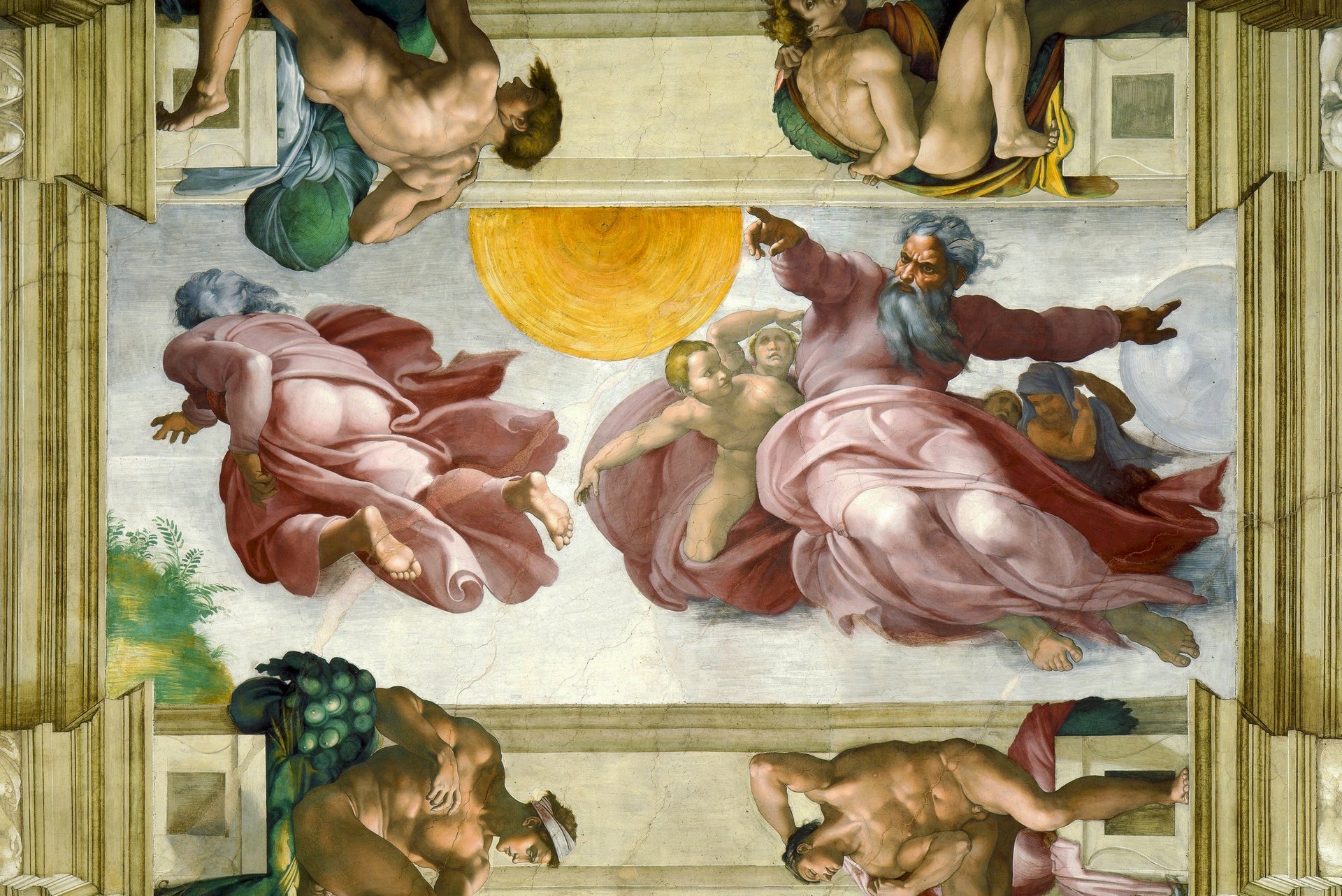 Три эпизода Создания иллюстрируют первую главу Бытия. Цикл начинается с первого дня: Бог создаёт свет и отделяет свет от тьмы. События следующего, второго дня, - отделение суши от вод, в нарушение хронологии вошли в третью сцену. В центральной фреске группы, самой большой из трёх, Творец изображён дважды. В день третий Бог создает Землю и растительность, в четвертый - светила (Солнце и Луну), чтобы управлять ночью и днём, временем и сезонами года. Согласно Книге Бытия, на пятый день Бог создал животный мир, но Микеланджело пропустил эту часть повествования.