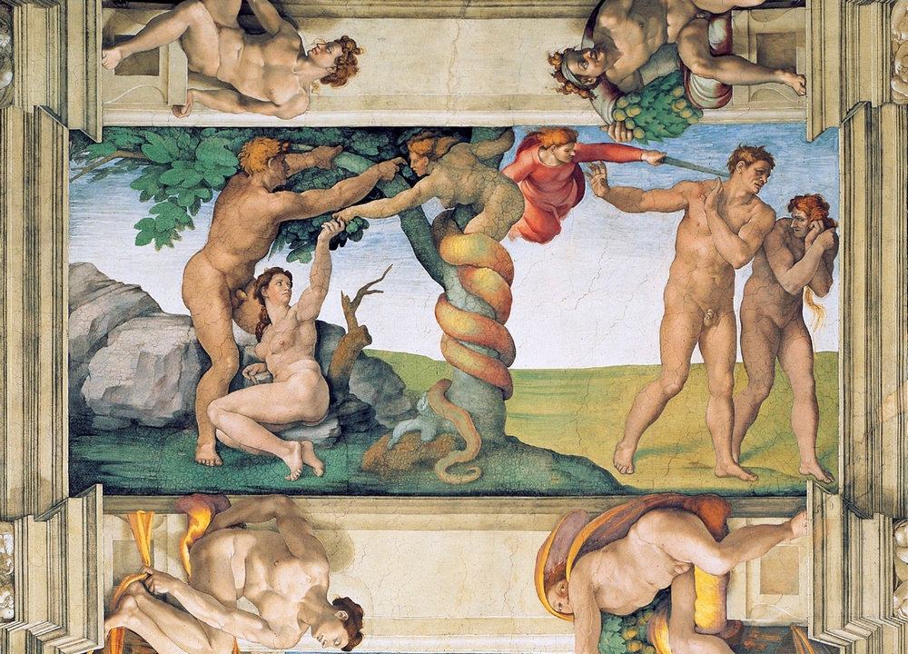 В заключительной картине истории Адама и Евы Микеланджело соединяет две сцены: Грехопадения и Изгнания из Рая. Слева Ева, доверчиво принимающая плод из руки Змея, и Адам, нетерпеливо выбирающий плод для себя; справа - ангел с мечом изгоняет их из Рая, в мир, где они потеряли вечную молодость и бессмертие.