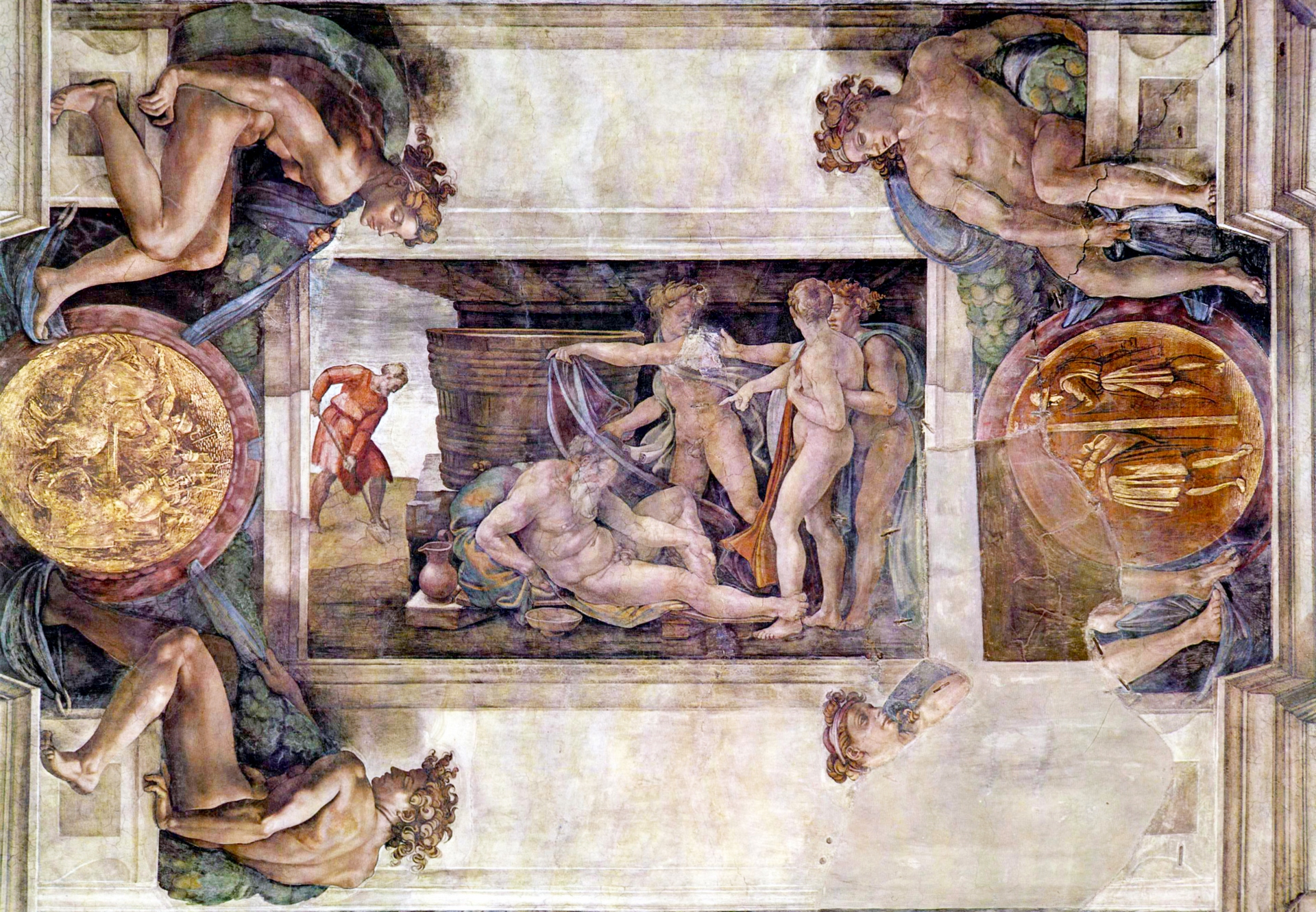 Заключительная сцена - Опьянение Ноя. Высадившись на сушу, Ной выращивает виноград. Ной, возделывающий землю изображён на заднем плане слева. Сделав вино, он выпивает его и засыпает обнажённым. Его младший сын, Хам, насмехаясь, показывает отца двум своим братьям Симу и Иафету. Старшие дети почтительно накрывают Ноя плащом. Хам был проклят Ноем, его потомки должны были служить потомкам Сима и Иафета. Три картины истории Ноя, символизируют длинный путь, проделанный от Божественного создания до грешного человека. Однако, именно через Сима и его потомков, израильтян, в мир должно прийти Спасение.