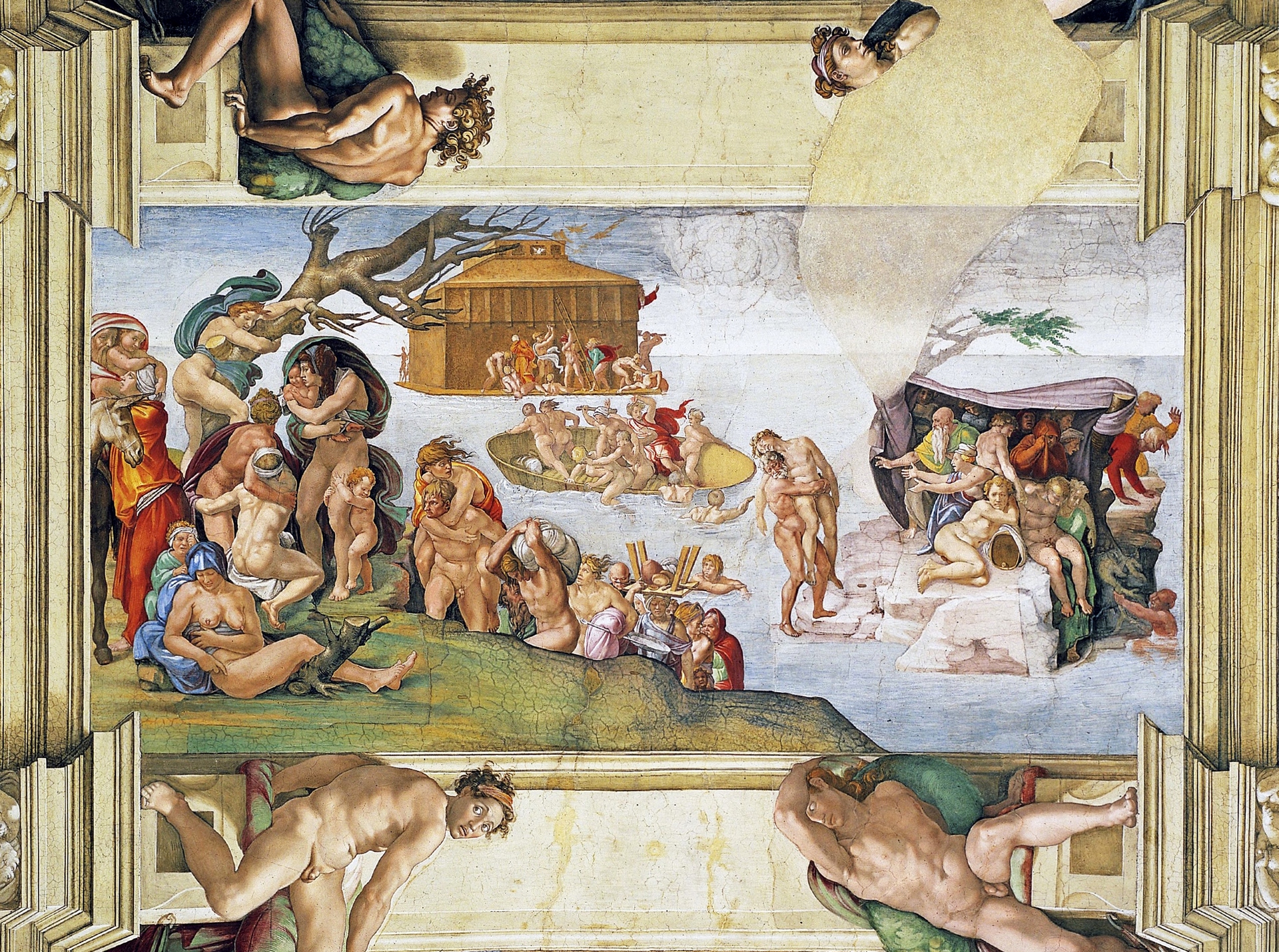 Картина Всемирного Потопа занимает центральное место в истории Ноя. В то время, как отчаявшиеся люди выбираются на клочок суши, не покрытый водой, на заднем плане виден ковчег, в котором спасается семья Ноя. Эта панель с самым большим количеством персонажей по сравнению с остальными фресками.