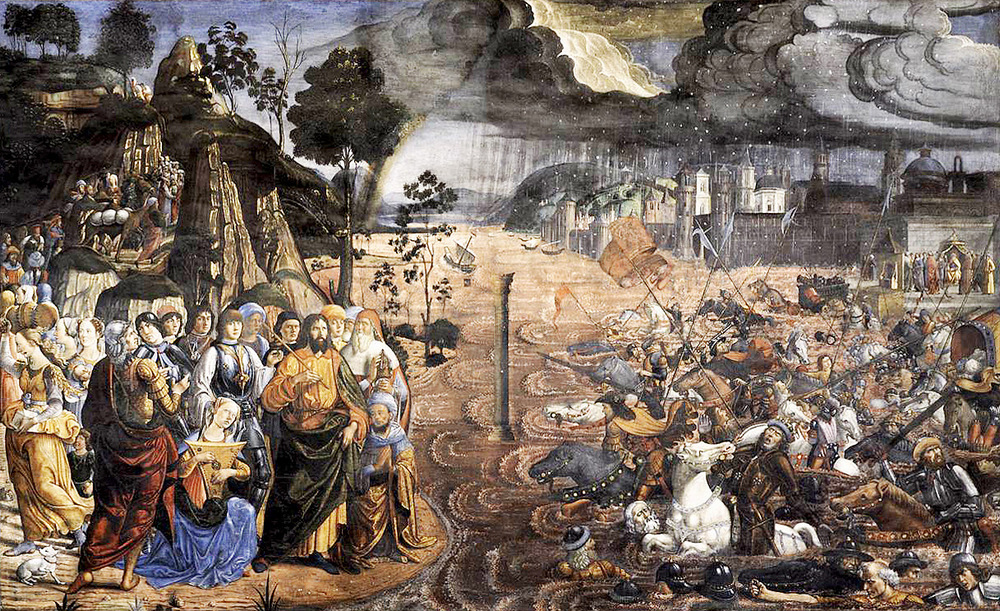12. Начало повествования находится справа на заднем плане, Моисей и Аарон просят фараона отпустить евреев из рабства. На переднем плане справа египетские солдаты, одетые и вооружённые типично для Италии эпохи Возрождения, тонут в водах Красного моря, сомкнувшихся после прохода евреев, проведённых Моисеем. Колонна над водой в центре символизирует облачный столп, посланный Яхве, чтобы устрашить египтян. В центре сверху изображена буря, насланная Богом в наказание египтянам. Пробивающиеся лучи солнца и радуга слева служат символами грядущего освобождения евреев из египетского рабства. Слева запечатлены евреи, уже пересекшие море под водительством Моисея, облачённого в жёлтые и зелёные одежды. Их процессия продолжается на заднем плане и исчезает в глубинах пейзажа. Рядом с Моисеем изображена его сестра, пророчица Мириам, играющая на струнном инструменте.