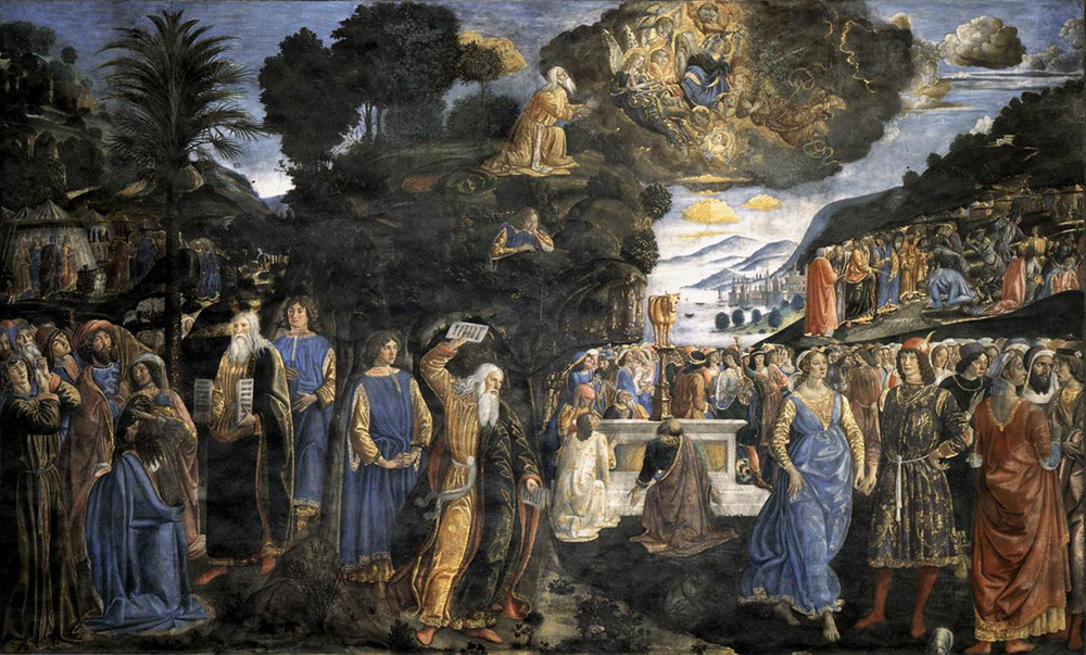 13. В центре сверху изображён коленопреклонённый Моисей, получающий Скрижали Завета от Яхве, явившегося в светящемся облаке и окружённого ангелами. Рядом с Моисеем спящий Иисус Навин. На переднем плане слева Моисей приносит скрижали в лагерь евреев. В центре на заднем плане изображён алтарь с золотым тельцом, некоторые из евреев поклоняются ему (они показаны со спины, что обычно для отрицательных персонажей, как, например, Иуда Искариот в "Тайной вечере"). На переднем плане Моисей, придя в ярость, разбивает скрижали. На заднем плане справа Моисей, во главе левитов, наказывает идолопоклонников. Будущий преемник Моисея, Иисус Навин, изображён рядом, в сине-жёлтых одеждах.
