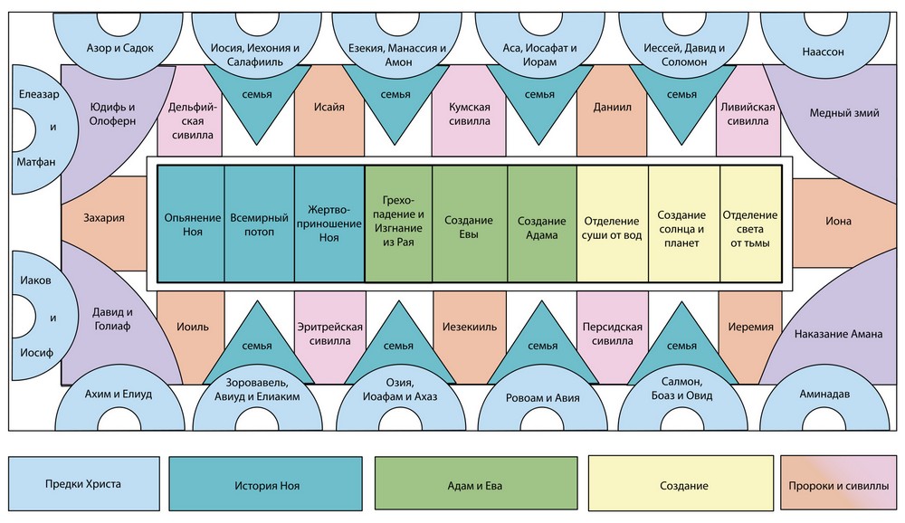 Существует также некоторая связь между фигурами в пазухах свода и в люнетах. Из-за ограничений треугольной формы, в каждом пазухе фигуры располагаются на земле. В шести из восьми из них композиции напоминают традиционные изображения