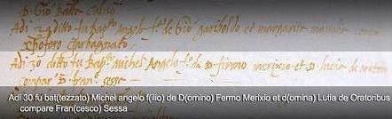 Текст крестильной книги не очень хорошо сохранился, только под лучами специальной лампы, удалось прочитать и перевести полностью запись 1571 года. 30 сентября крестили младенца, родившегося накануне в день его патрона Михаила Архангела, поэтому переезд за один день из Бергамо в Милан новорожденного в то время был невозможен. Значит, он уже родился в Милане, в центральном приходе, где и проживала семья Меризи в то время.