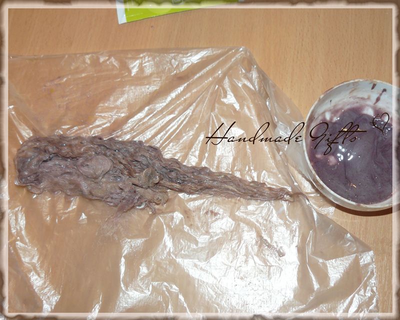 Берем понемногу из кучки волосы в левую руку, а правой берем немного краски и наносим на локоны. Краску не втирать - можно так свалять всю шерсть. Да, и кучку можно разделить еще на несколько, чтобы брать удобно было.