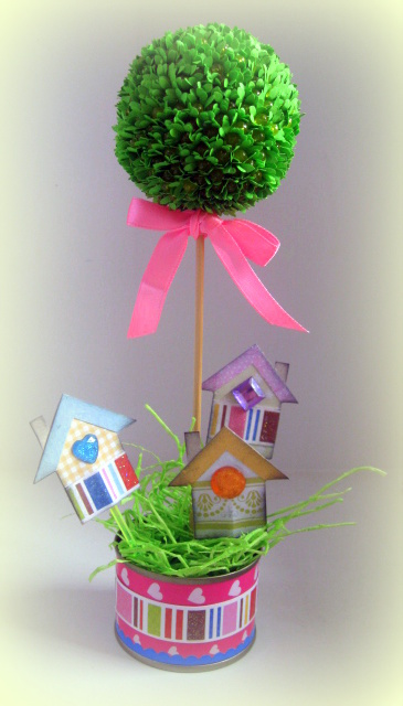 Основа кроны - пенопластовый шарик, обклеенный множеством дырокольных цветочков при помощи пластмассовых гвоздиков. Горшочек сделан из баночки под томатной пасты. В качестве украшения мини-домики.