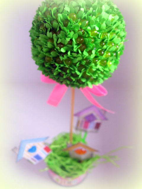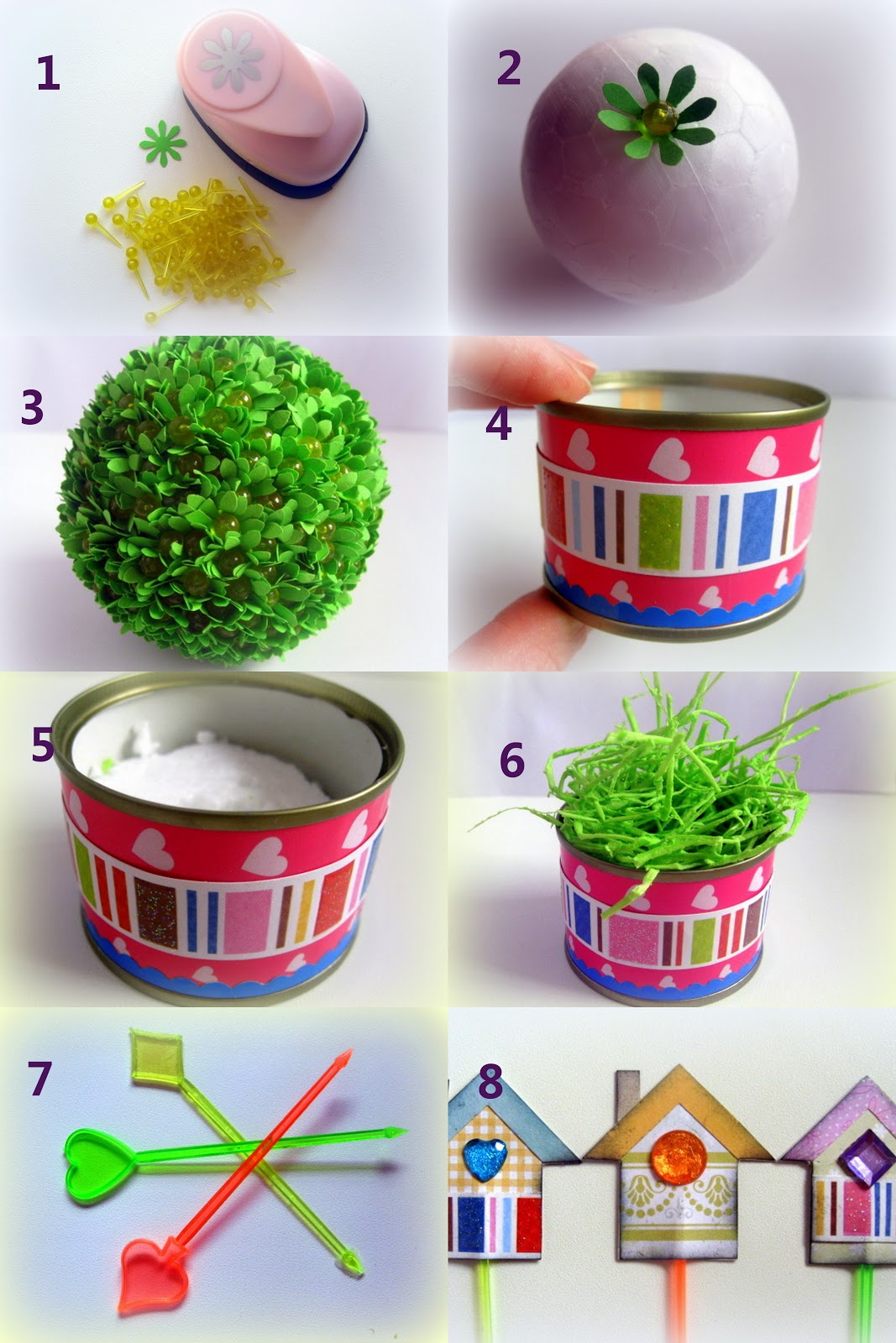 Итак, дыроколим много-много цветочков и обклеиваем ими наш шарик с помощью гвоздиков. Декорируем баночку, которая будет у нас в роли горшка. Вставляем в нее пенопласт и закрываем его нашей импровизированной травкой. Затем на шпажки для конопе наклеиваем декоративные элементы - у меня это домики, а может ваша фантазия подскажет сделать из них цветы или бабочек? Насаживаем крону деревца на деревянную шпажку, вставляем в горшочек, украшаем на ваш вкус и любуемся результатом.