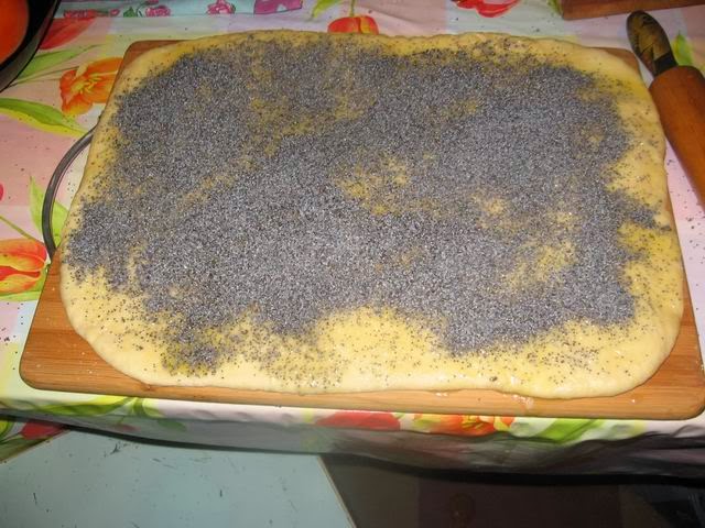 Смазываем растопленным сливочным маслом, посыпаем сахаром и маком. Мак сухой, но чистый.