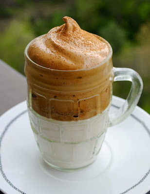 Растворимый кофе, сахар и горячая вода (в равных количествах) взбиваются миксером в плотную пену, а затем эта смесь добавляется к горячему или холодному молоку. Никогда бы не подумала, что кофе с водой и сахаром так легко и быстро превратить в воздушное облако! Попробуйте, это прикольно.