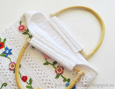 Сегодняшняя модель - это поле для вашего творчества. Легкая и простая сумка, связанная из толстого белого хлопка, украшена гирляндами летних цветов. При их создании вы можете дать волю воображению и получить море удовольствия от творчества! :-)