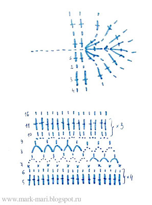 Идея рисунка очень проста. Выбираем незамысловатый ажурный узор и чередуем его с гладким узором, связанным столбиками с накидом и без. Вяжем по кругу так, чтобы у нас получилось три полосы для украшения гирляндами. Закончим вязание элементами для крепления ручек. Сумочку нужно постирать, высушить, отпарить утюгом с обеих сторон.