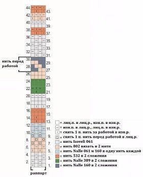 На спицы 6 мм нитью Isoveli набрать 49(52)55(58)62 п. и начать вязание резинкой 1х1 (1 лиц.п., 1 изн.п.) и узором рис с изн.р.: 8 петель резинкой и вязать 41(44)47(50)54 п. узором рис. Выполнить по рисунку 9 рядов, отложить 8 петель резинки на доп. спицу. Начать вязание текстурным узором с 5-го ряда схемы, повторяя раппорт узора. Выполнить 6–44 ряды схемы, и далее повторять 1-44 ряды, при этом в рядах 27-30 нить должна быть перед работой для формирования протяжек по лицевой стороне.