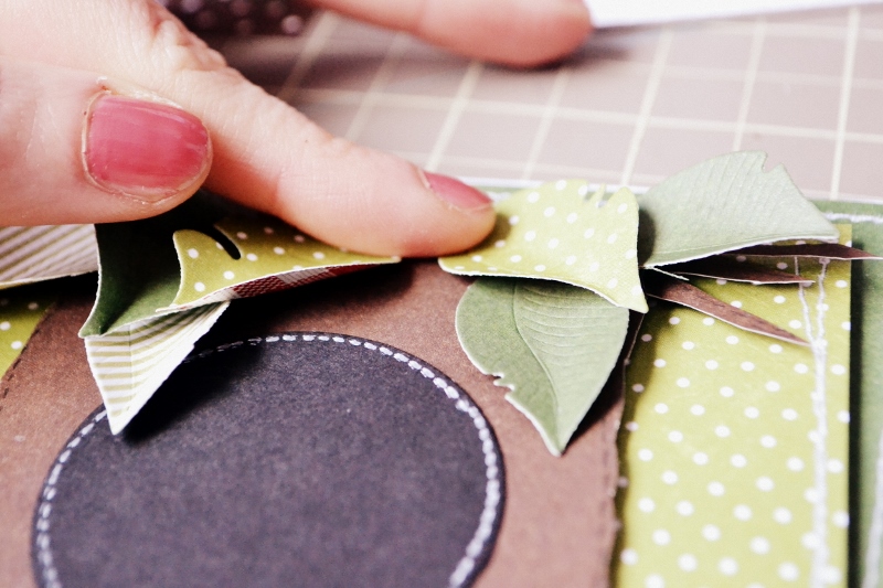5. Приклеиваем импровизированное жилище совят и сделанные с помощью ножей или дыроколов листочки.