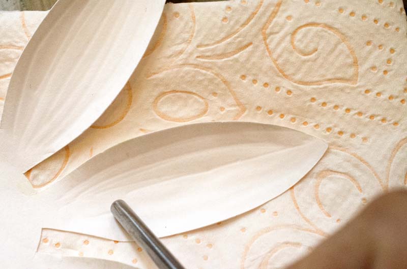 Я всегда делаю тиснение на обычном бумажном кухонном полотенце, сложенном в 6-8 слоев. Тут есть маленькая хитрость - я слегка (совсем-совсем слегка) сбрызгиваю эту стопочку из полотенца водой. Получается, что моя подложка для тиснения чуть влажная, тогда ничего не скользит, и заготовка, над которой вы работаете, не высыхает мгновенно.