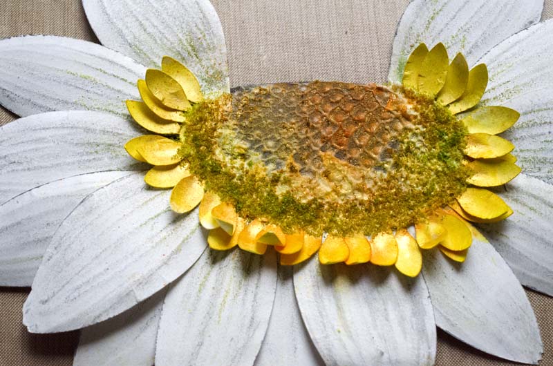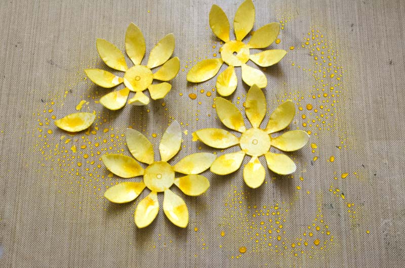 Как высохнет паста, красим темно-желтым спреем серединку, золотистым - края.