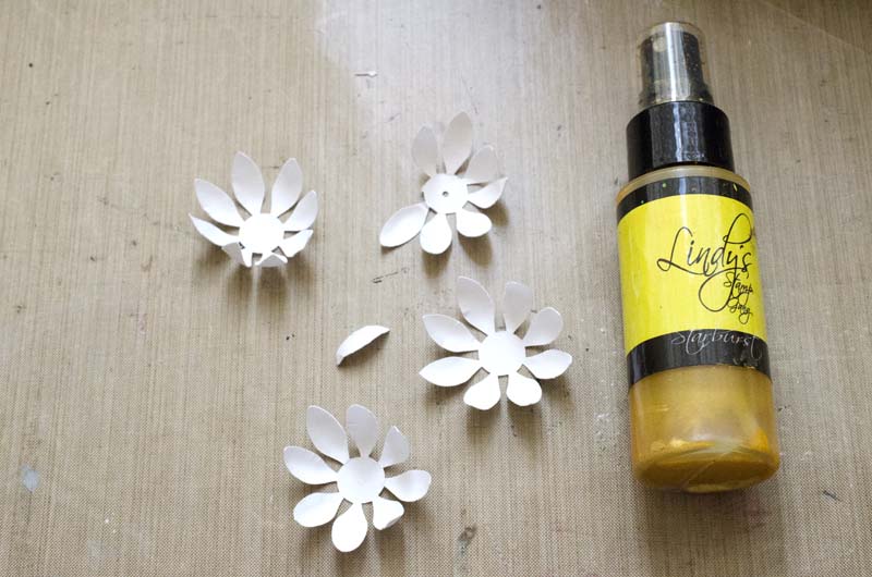 Наступила очередь покраски. Сначала красим маленькие цветочки спреем Lindy's Stamp Gang, цвет желто-золотистый.