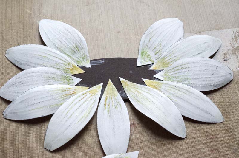 Продолжаем... Вырезаем из коричневого плотного картона овал нужного размера (размером примерно как лепесток, но чуть больше). Заготовки разрезаем на отдельные лепестки и приклеиваем вот таким образом на коричневый овал.