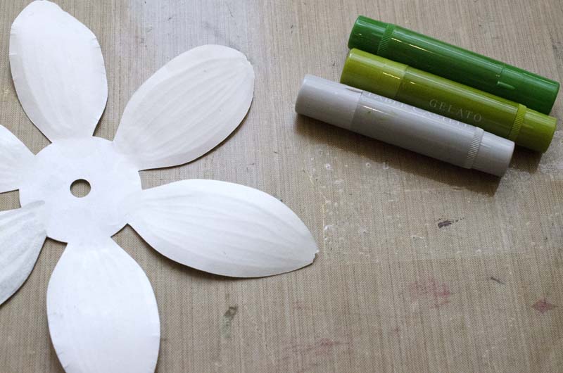 А тем временем приступаем к окраске большой заготовки. Это ведь у нас лепестки ромашки, поэтому представляем в уме настоящую ромашку. Это только кажется, что ромашка белая-белая, если нарисовать просто белую ромашку, она будет плоской и некрасивой. Значит, что? Значит, надо добавить к белому немного цвета... Какого?! Светло-серого и зеленого... Я взяла джелатосы этих цветов.