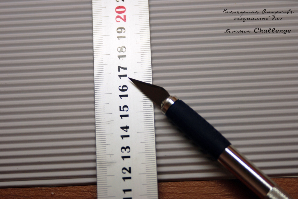 16. И теперь на лицевой стороне нашей обложки отмеряем середину, и по линейке проводим макетным ножом сверху вниз, но так чтобы не прорезать полностью бумагу, а только верхний слой.