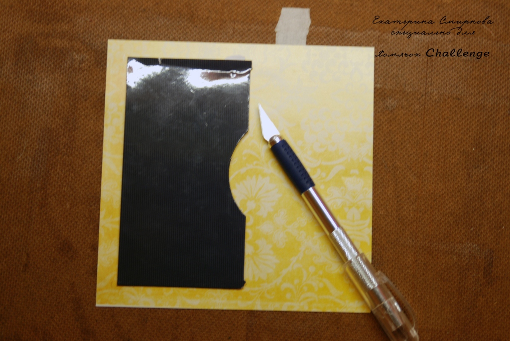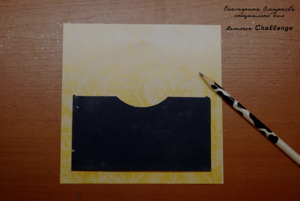 2. Берем наше лекало, низ кладем к предполагаемому низу картонки и обводим вырез под диск.