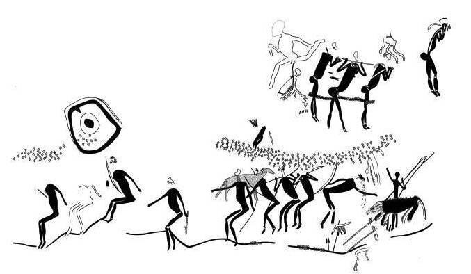 Нейтронная звезда на фоне звездного неба. Люди без голов - символическое обозначение жертв катаклизма. Прорисовка наскального рисунка. ЮАР. Африка.