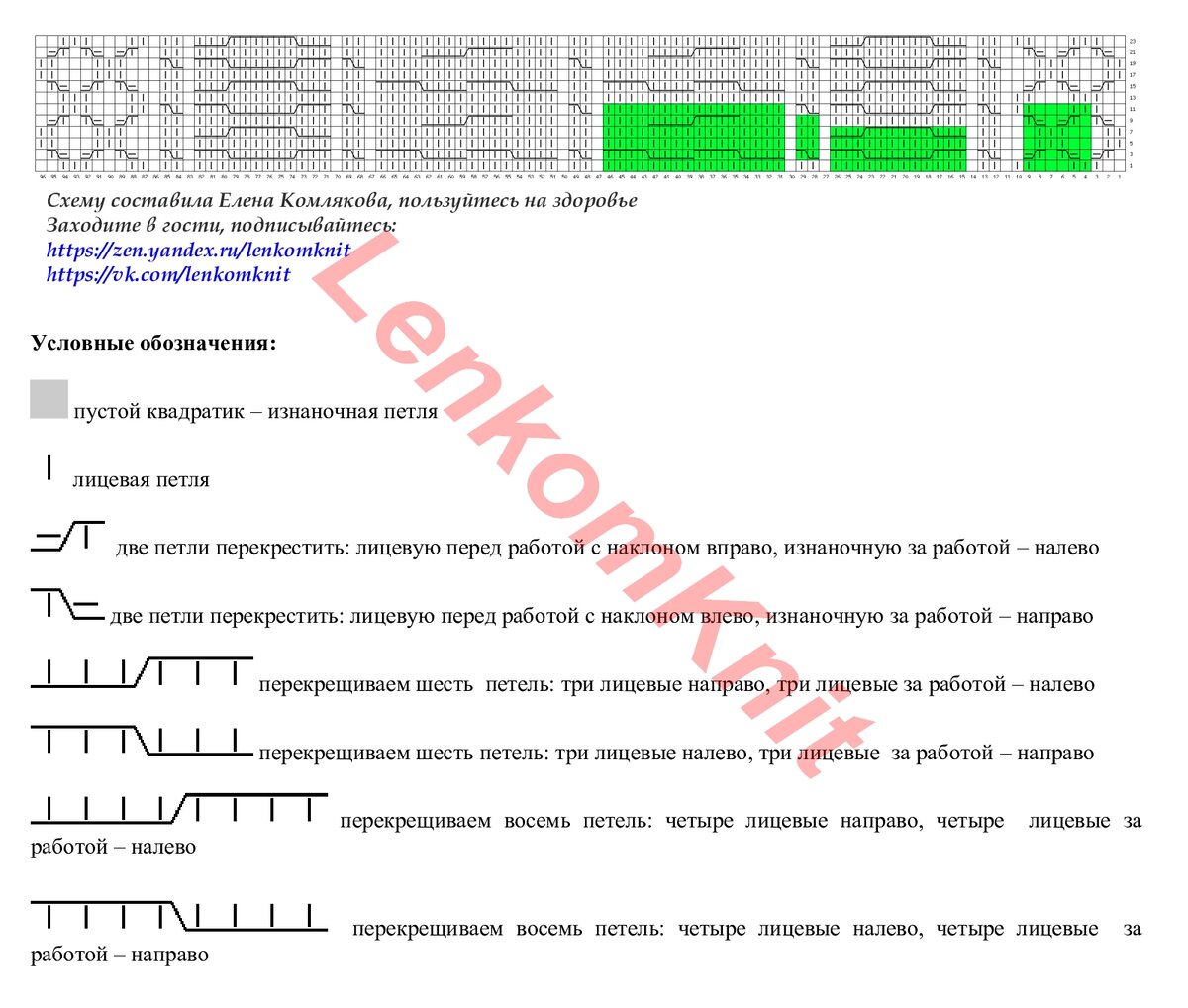 На рисунке - схема для вязания узора (центр). Раппорты жгутов и бокового узора выделены зеленым цветом.