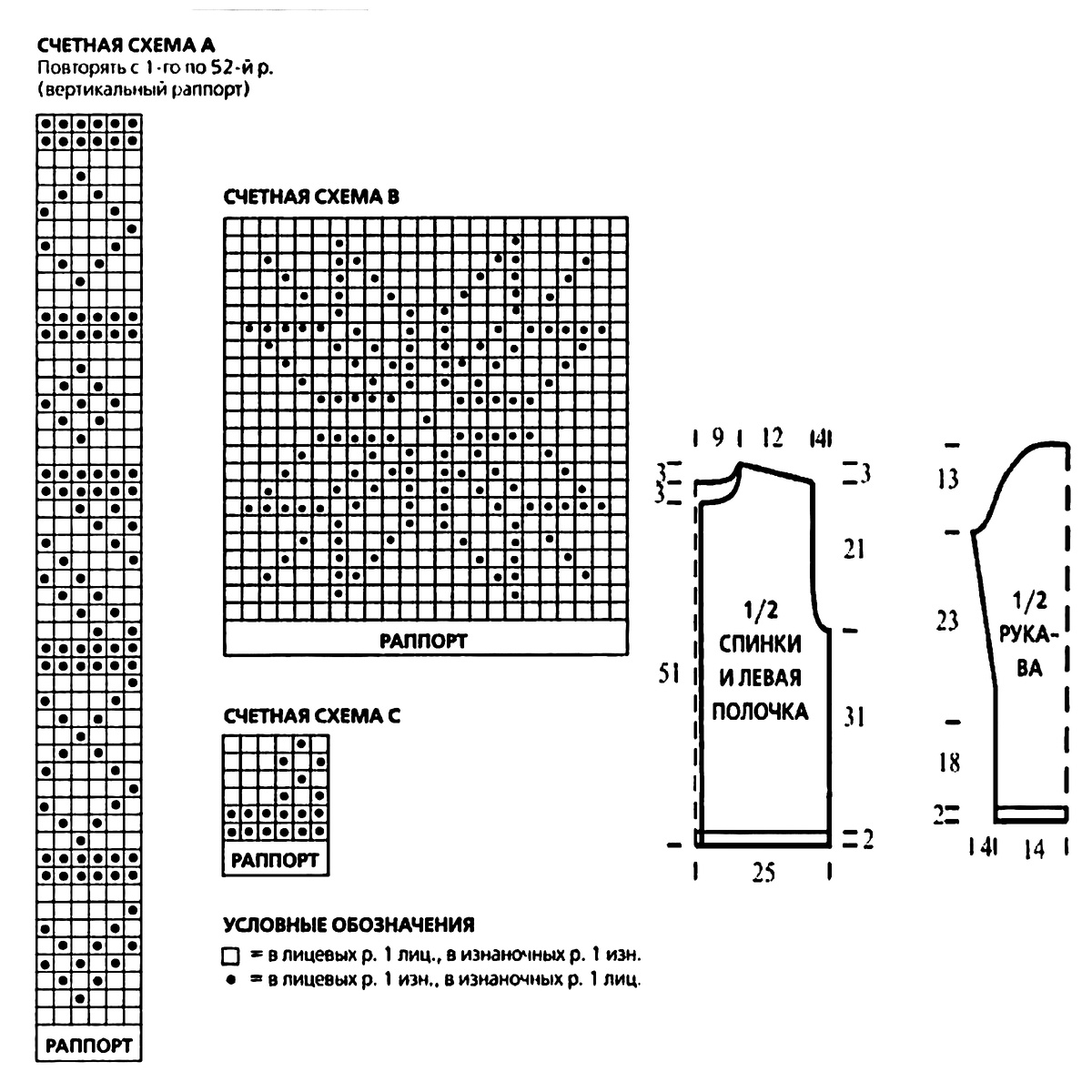 Рельефный узор А, В и С: вязать по счетным схемам А, В и С, в которых приведены лиц. и изн. р.