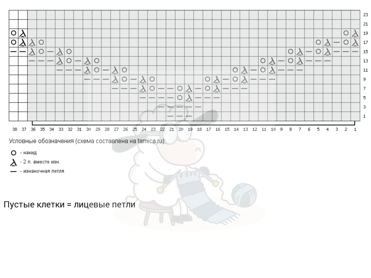 Раппорт узора выделен серым цветом. В нём 36 петель и 24ряда. Если хотите, чтобы "зигзаг" повторялся чаще, повторяйте ряды с 1-го по 20-й. На схеме только лицевые ряды, в изнаночных рядах все петли вяжите по рисунку, накиды — лицевыми.