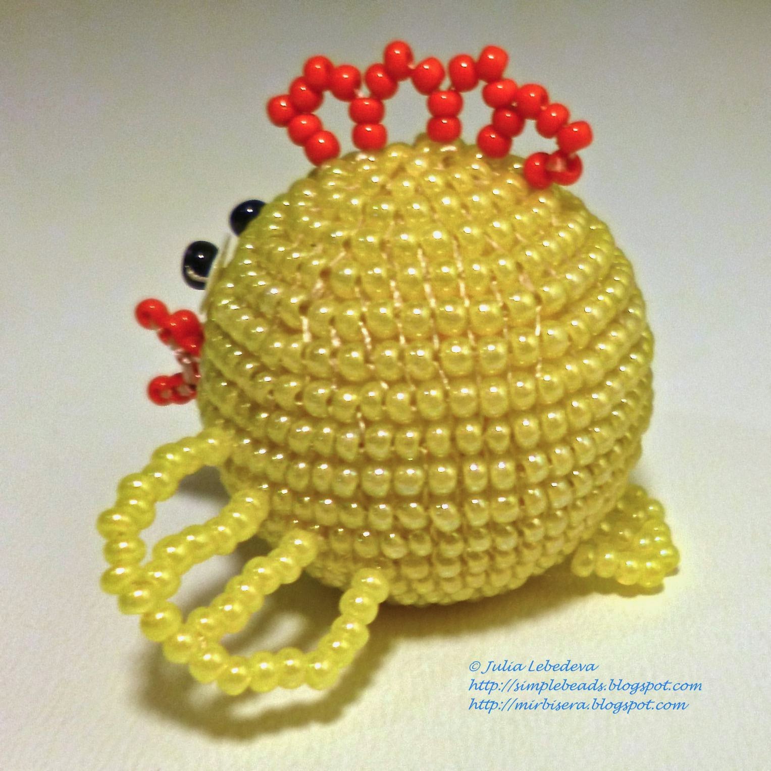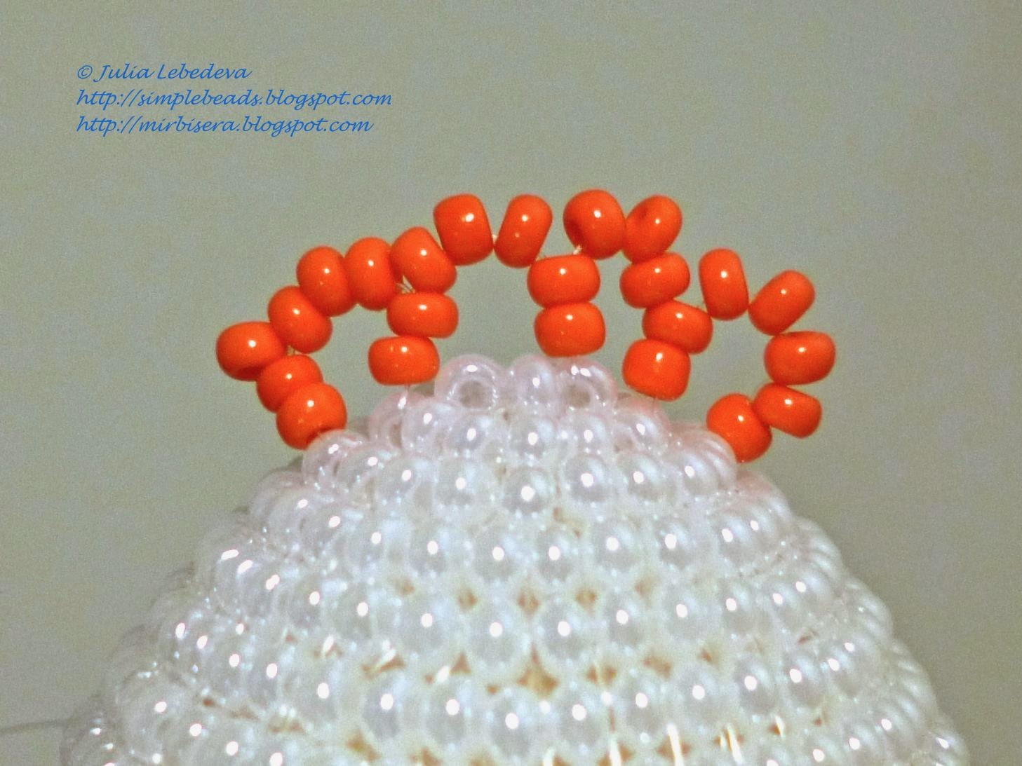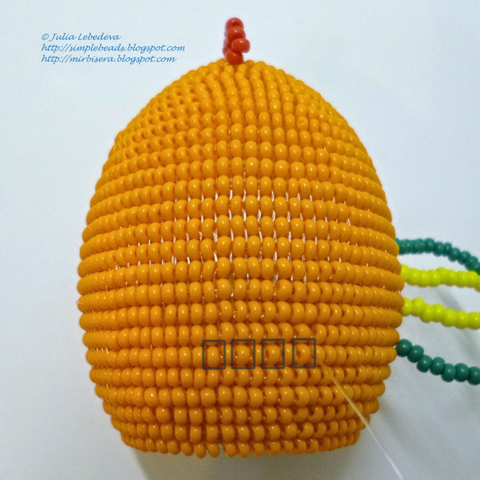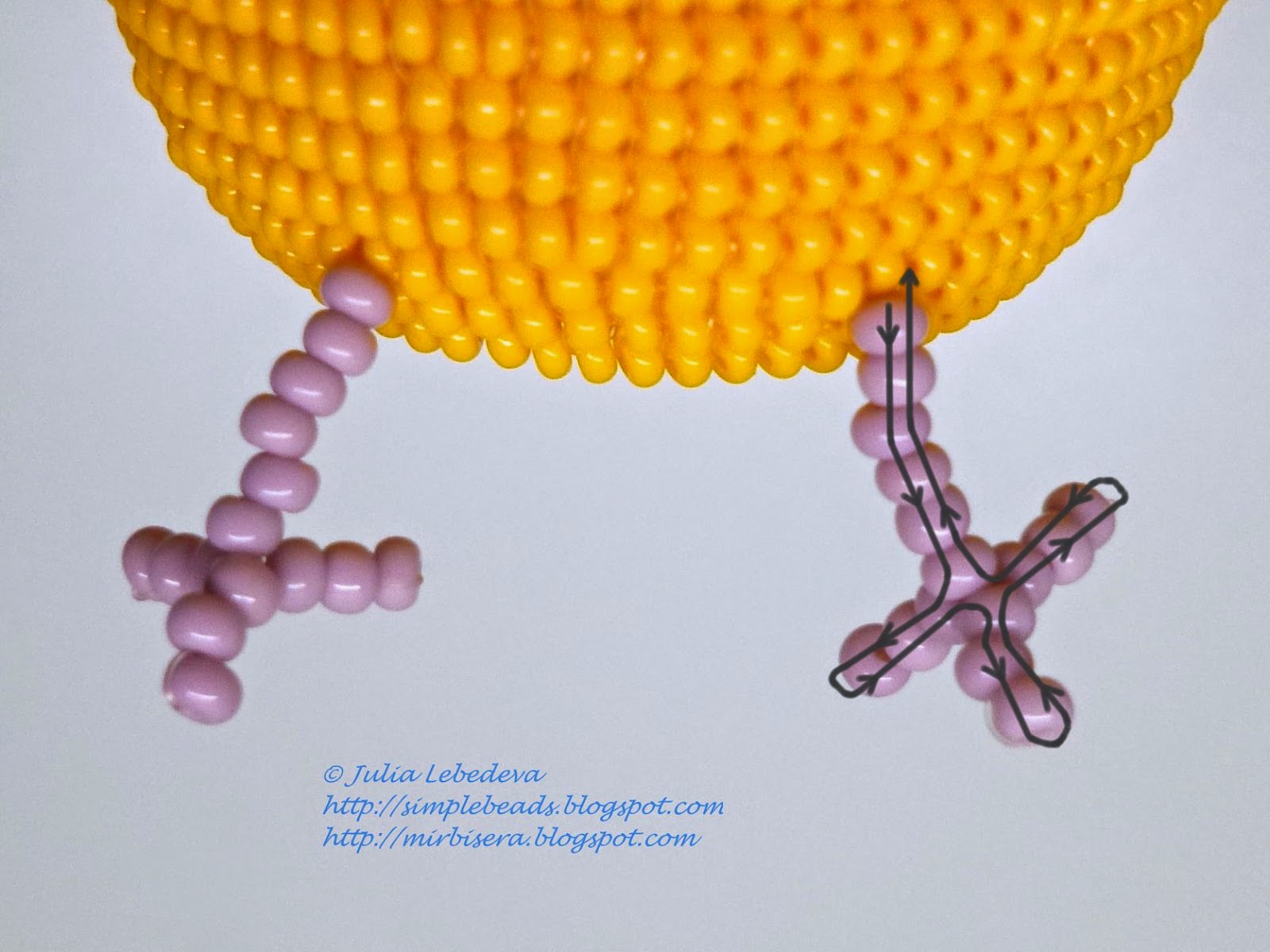 а снизу достаточно доплести до того уровня, чтобы цыплёнок смог ровно стоять, опираясь на бисеринки.