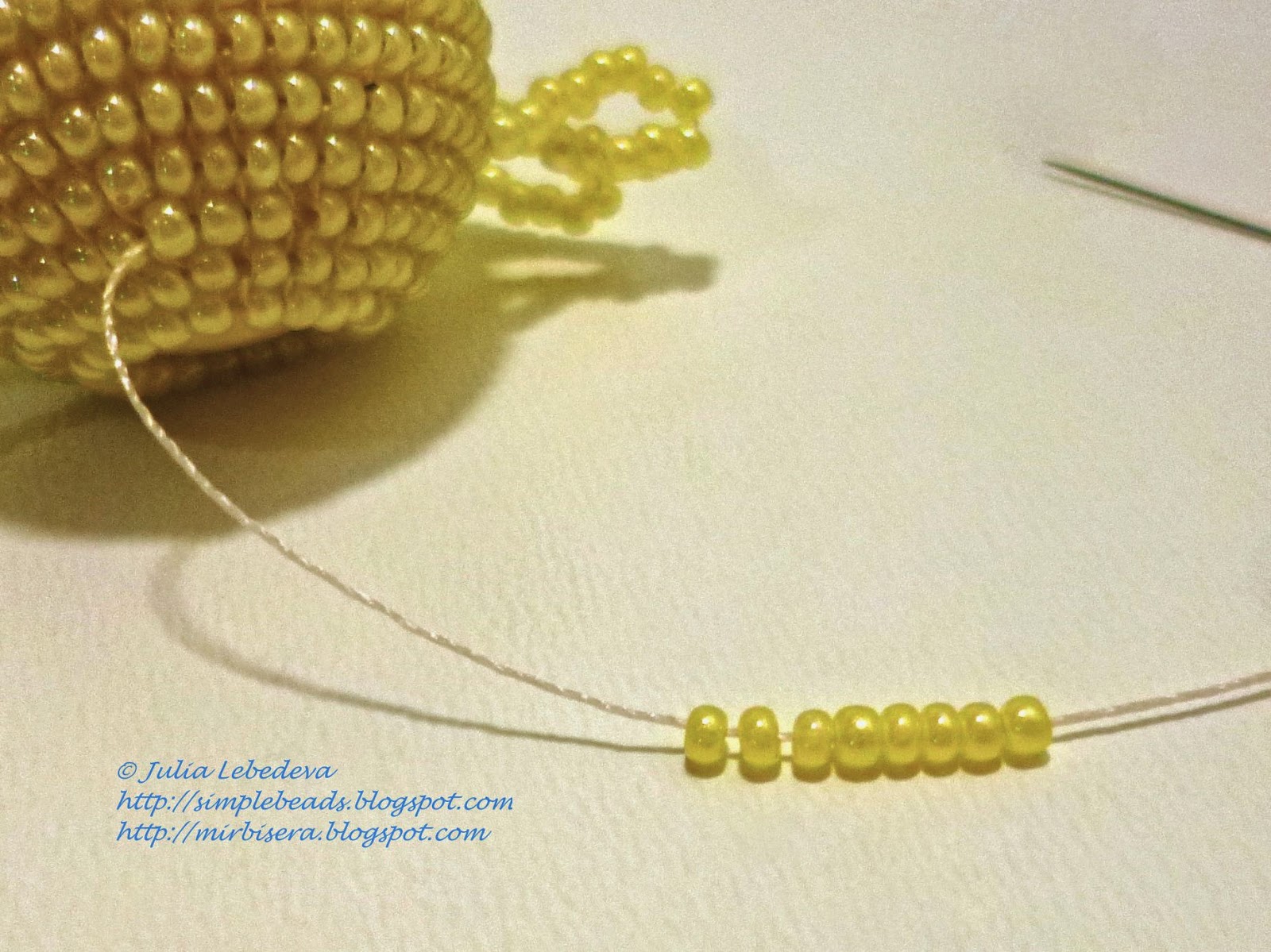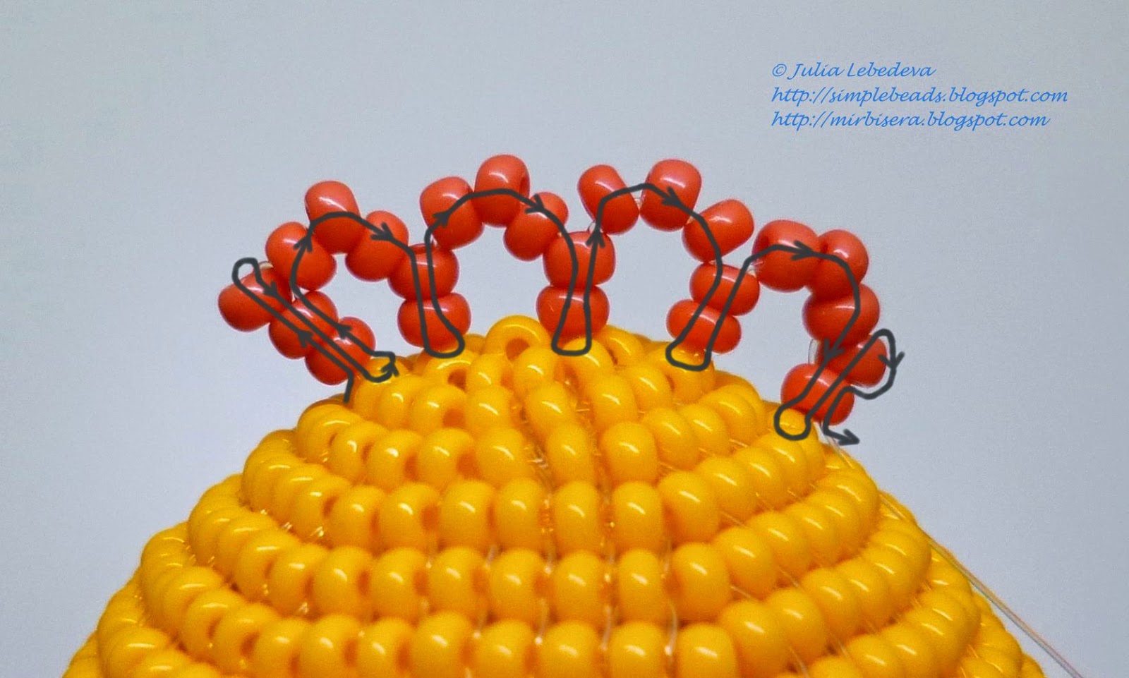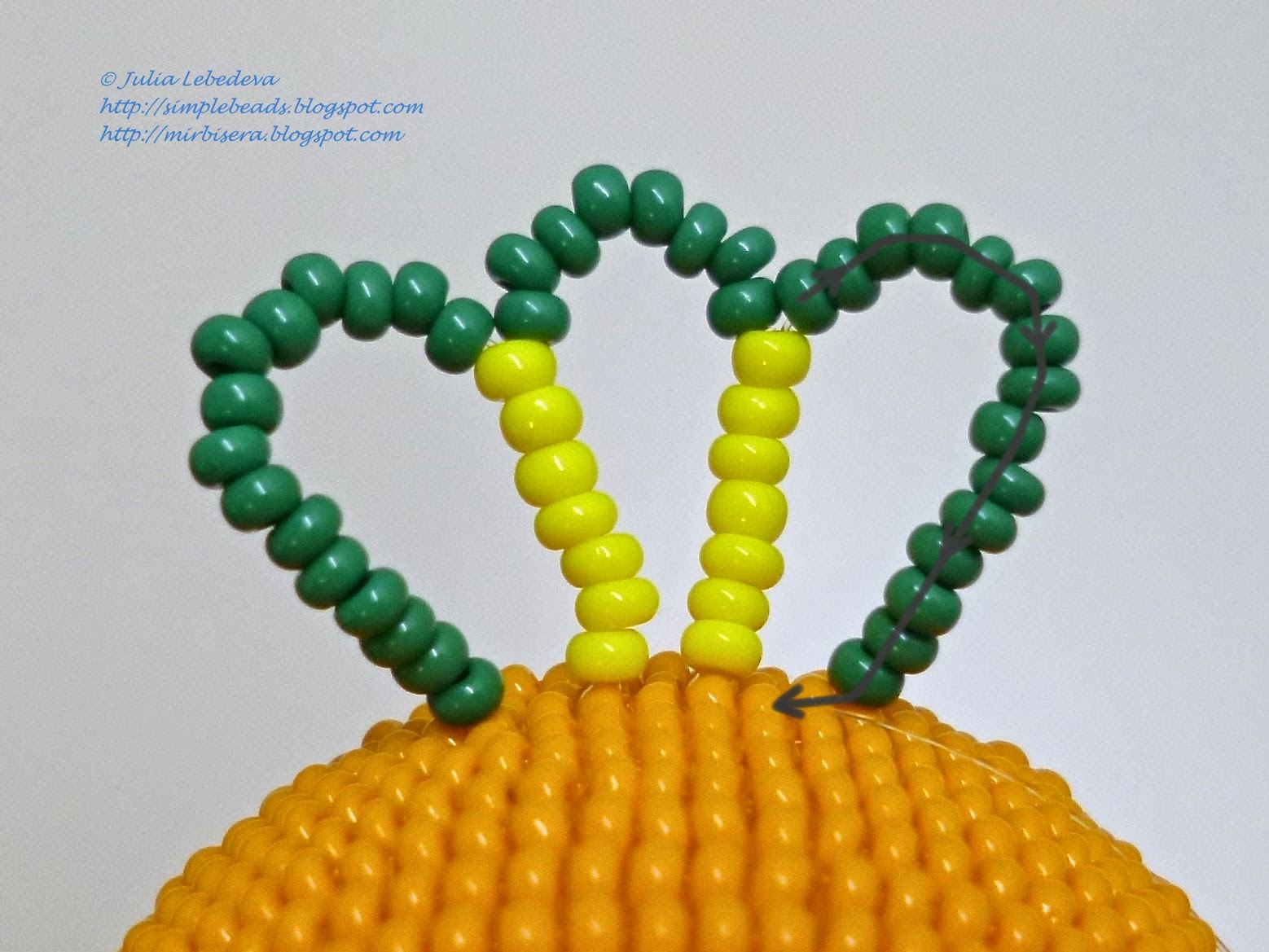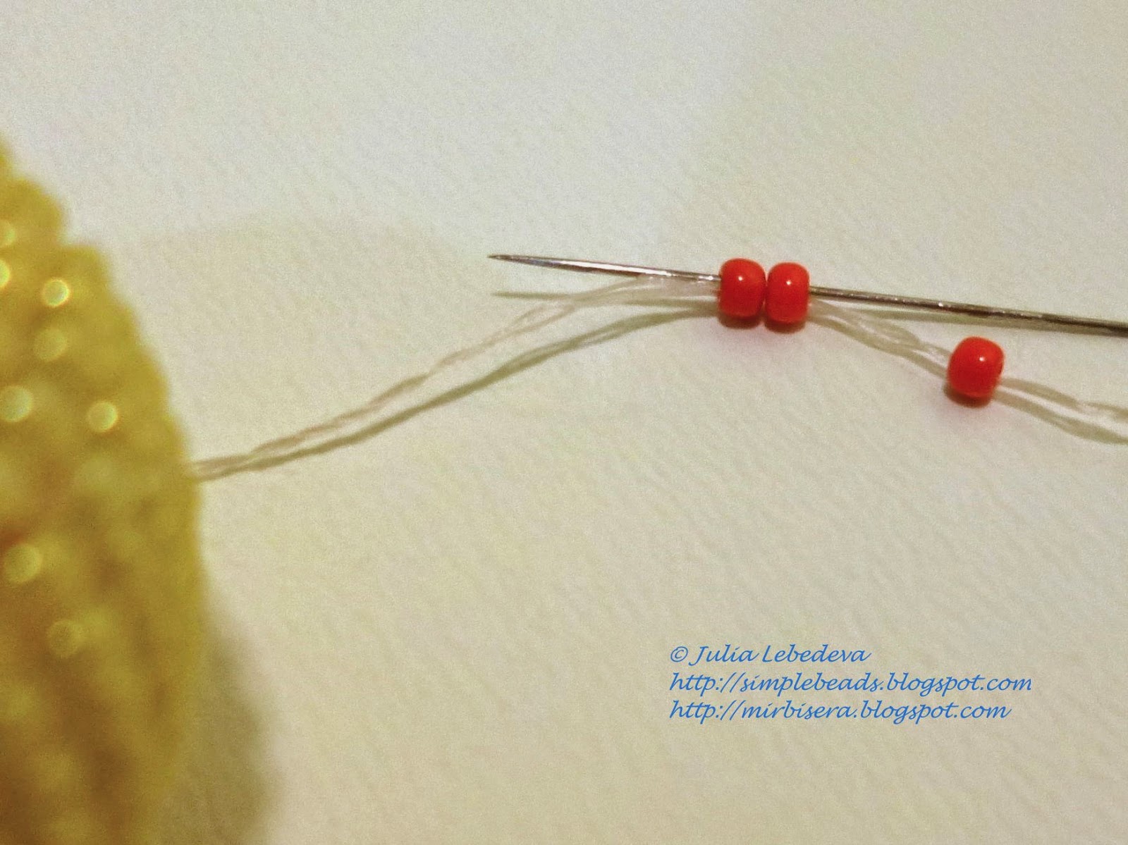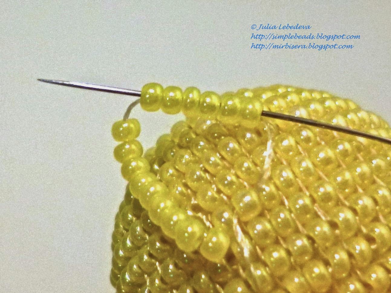 Пропускаем иглу через ближайшую жёлтую бисеринку, находящуюся во втором ряду макушки на прямой линии к центру,