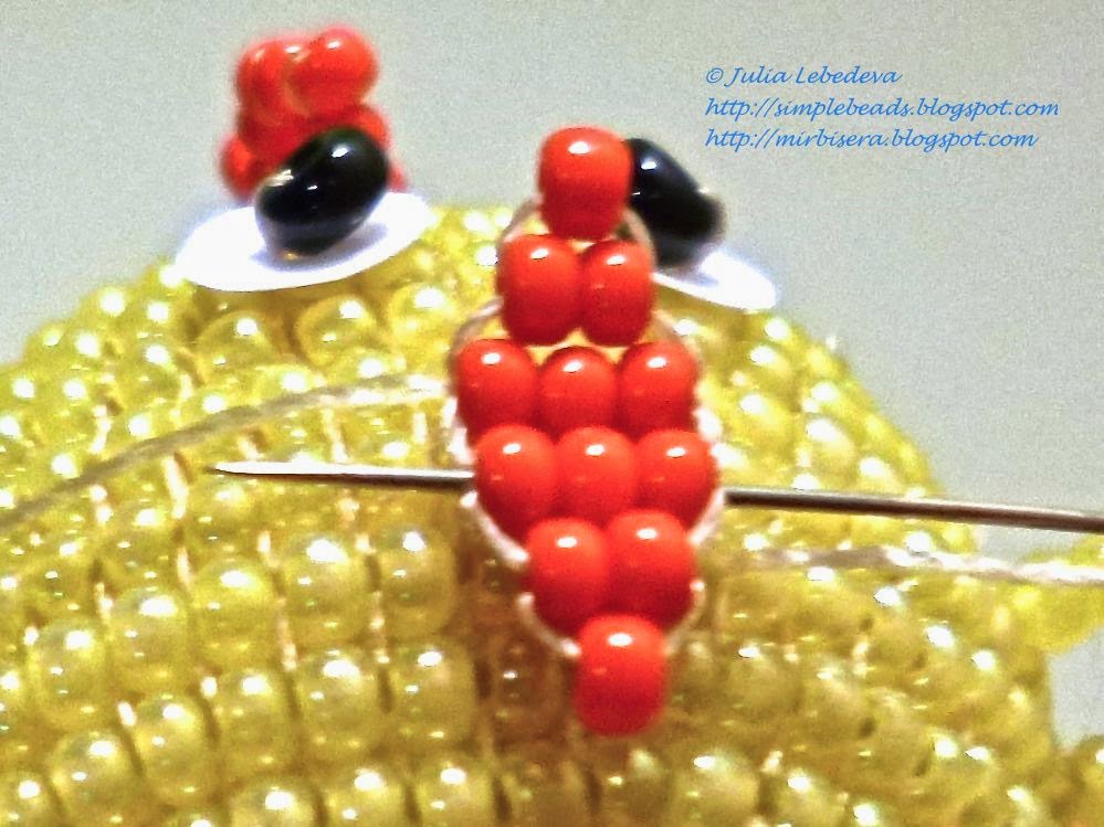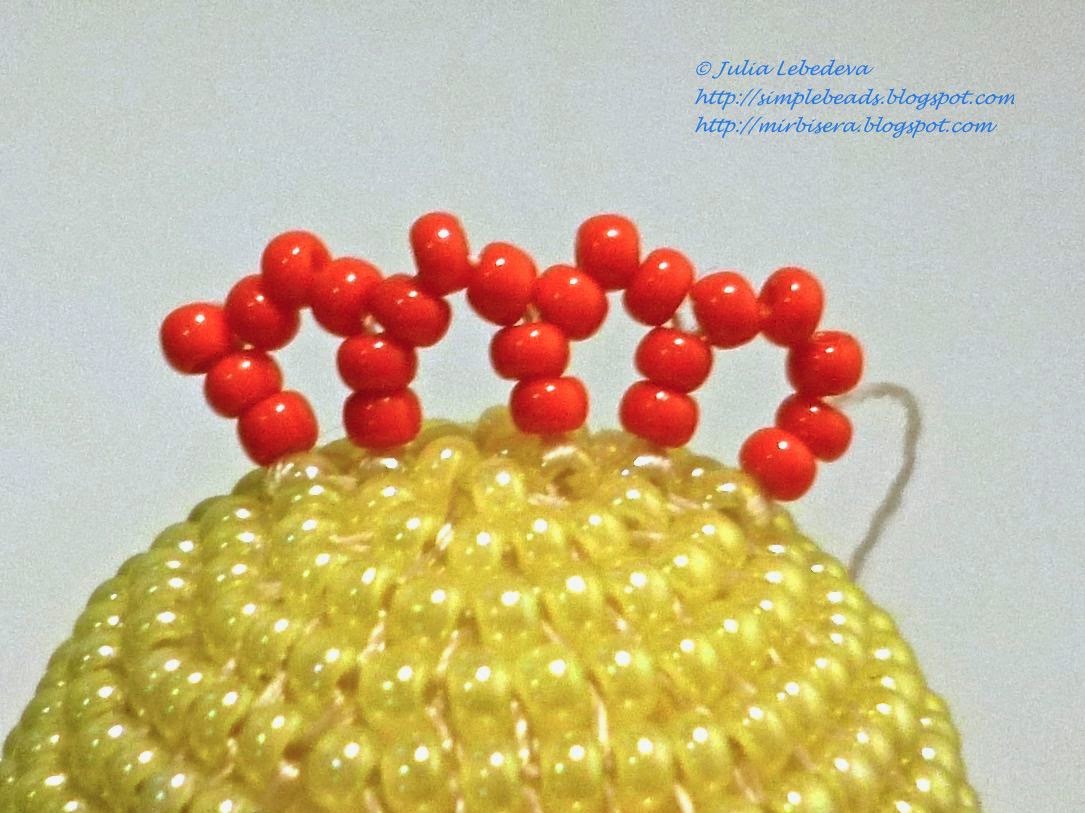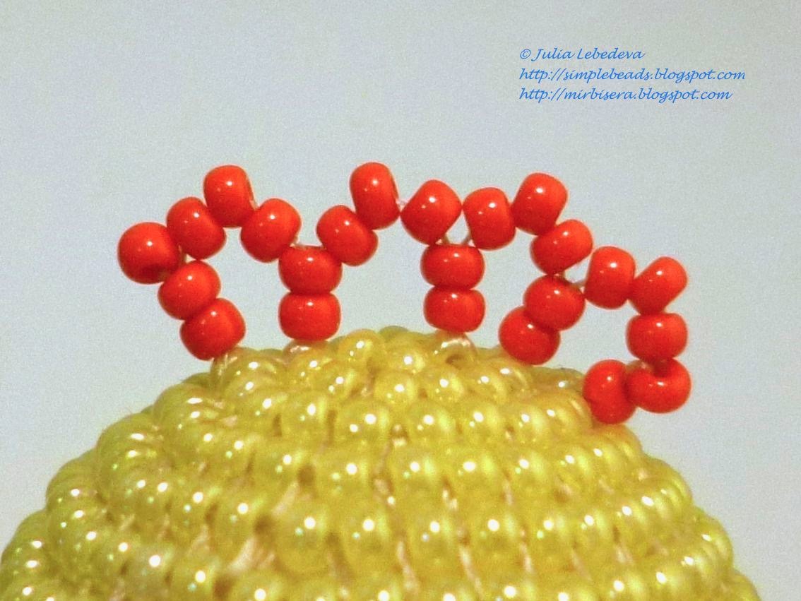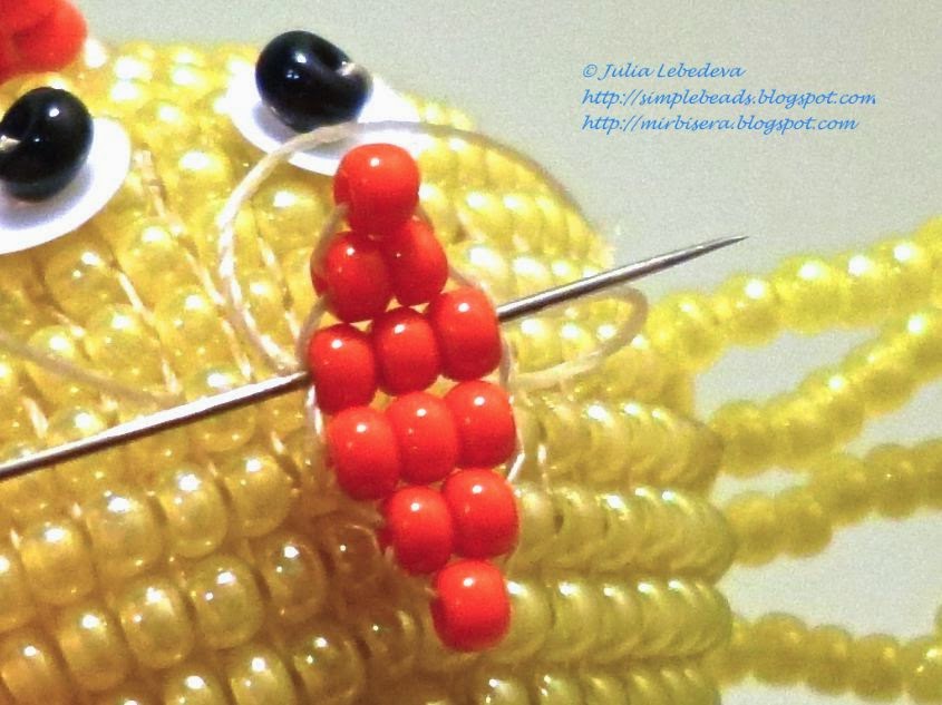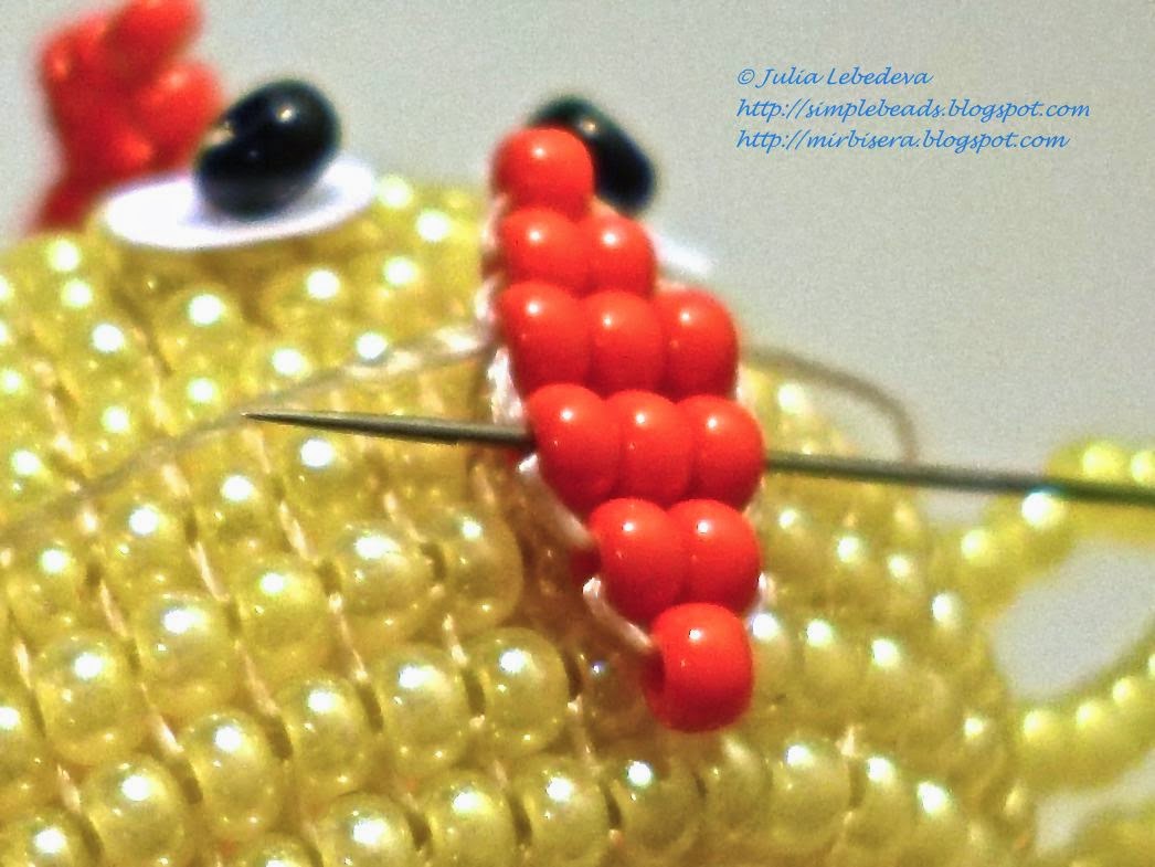 Таким же образом последовательно добавляем в гребешок цыплёнка ещё три отрезка по 5 красных бисеринок, каждый раз прикрепляя очередной этот отрезок к жёлтым бисеринкам, лежащим в последовательных рядах макушки цыплёнка на одной прямой.