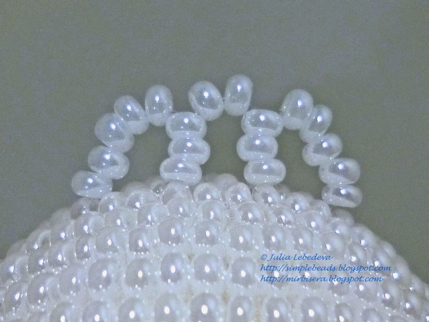 Далее делаем гребешок. Выводим рабочую нить так, чтобы она выходила из бисеринки, находящейся в третьем ряду от верхушки оплетённого мячика,